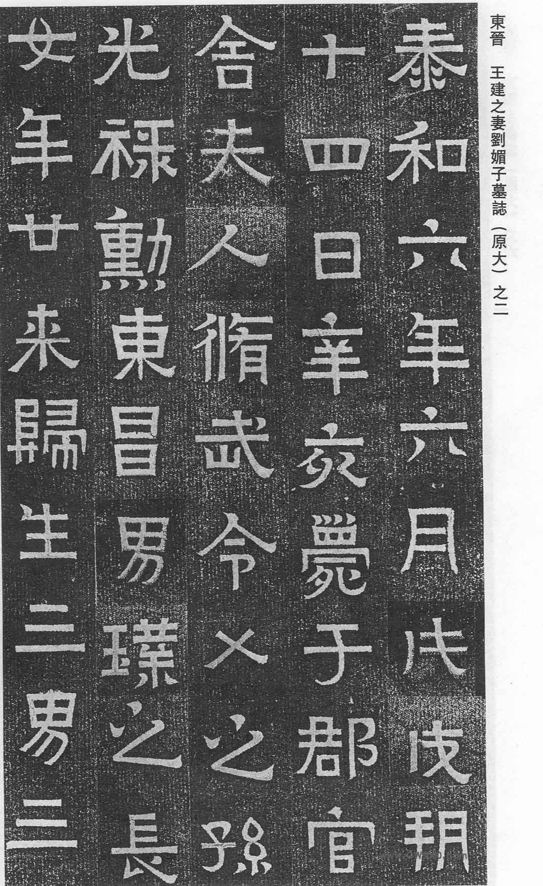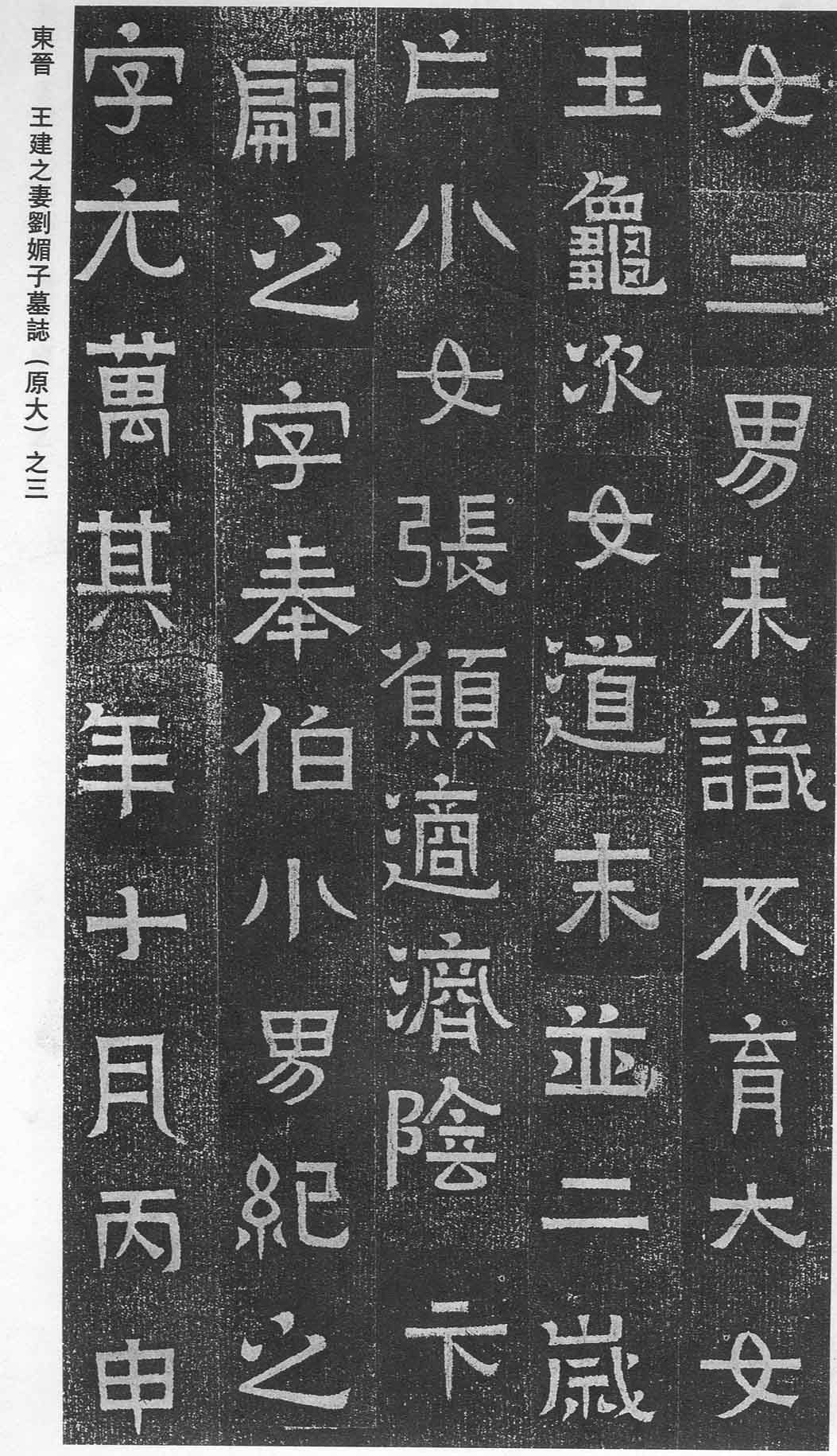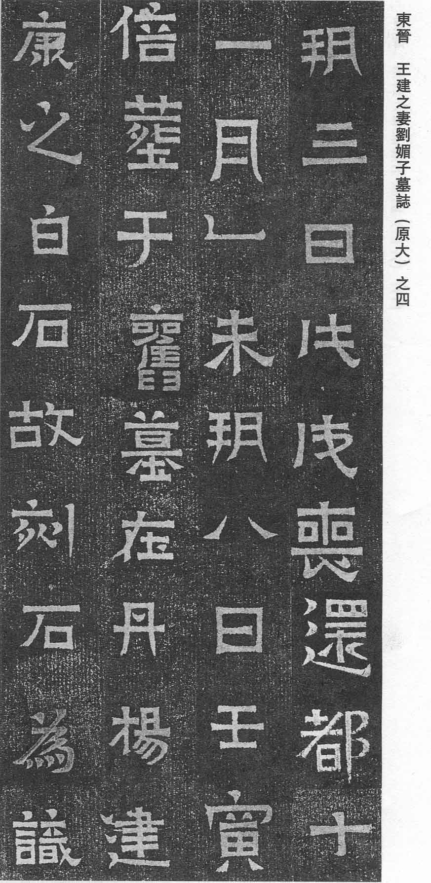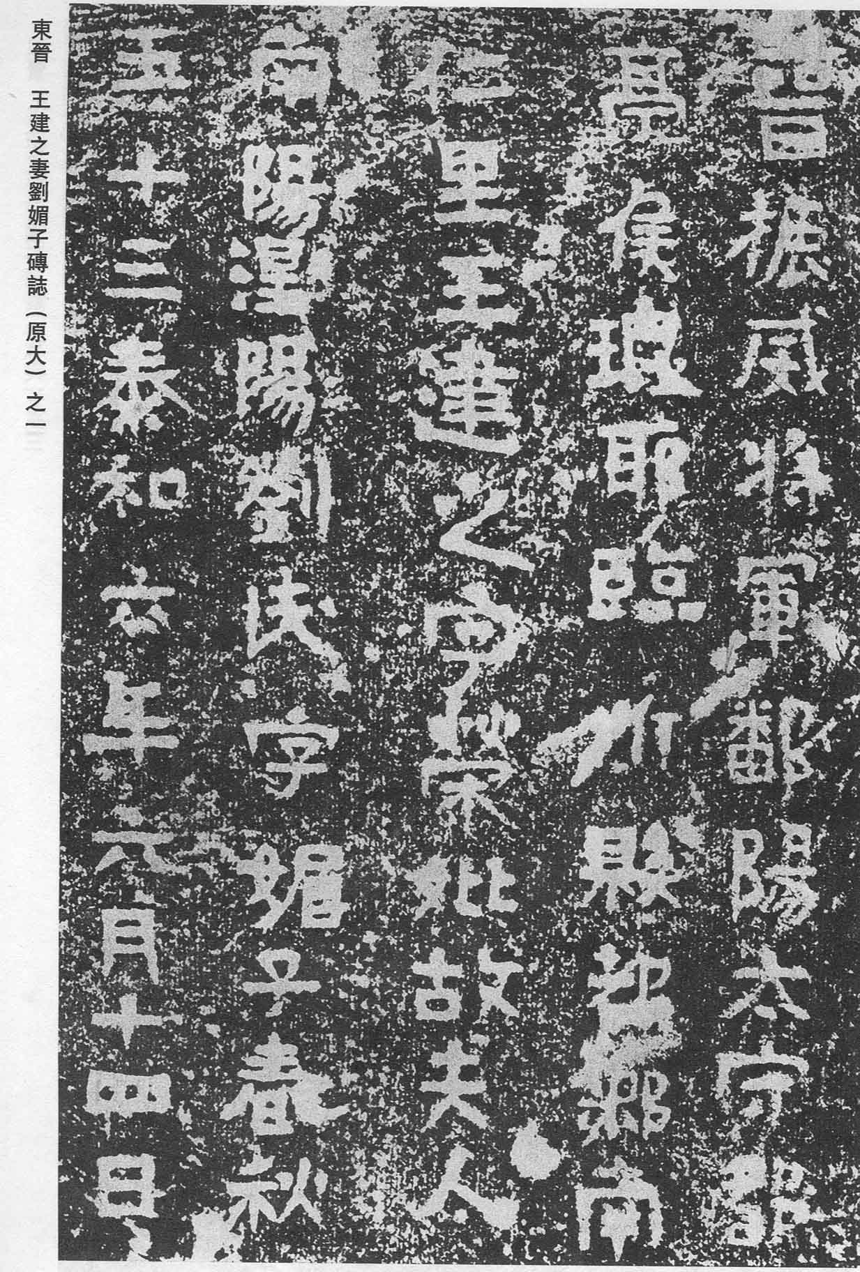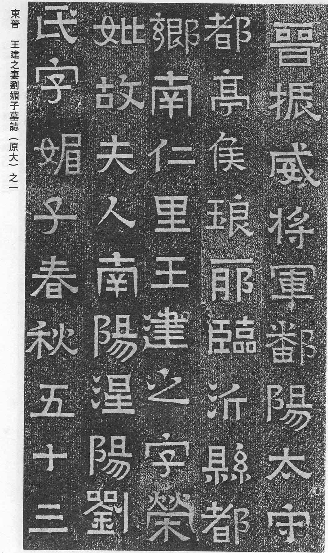 晋振威将军、鄱阳太守、都亭侯,琅邪临沂县都乡南仁里王建之,字荣妣,故夫人南阳湦阳刘氏,字媚子,春秋五十三,泰和六年六月戊戌朔十四日辛亥,薨于郡官舍。夫人修武令又之孙,光禄勋东昌男璞之长女,年廿来归,生三男三女。二男未识不育。大女玉龟,次女道末,并二岁亡。小女张愿,适济阴卞嗣之,字奉伯。小男纪之,字元万。其年十月丙申朔三日戊戌,丧还都。十一月乙未朔八日壬寅,倍葬于旧墓,在丹杨建康之白石。故刻石为识。