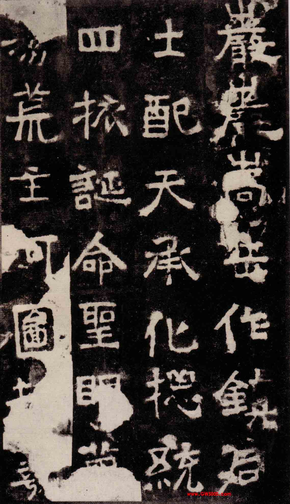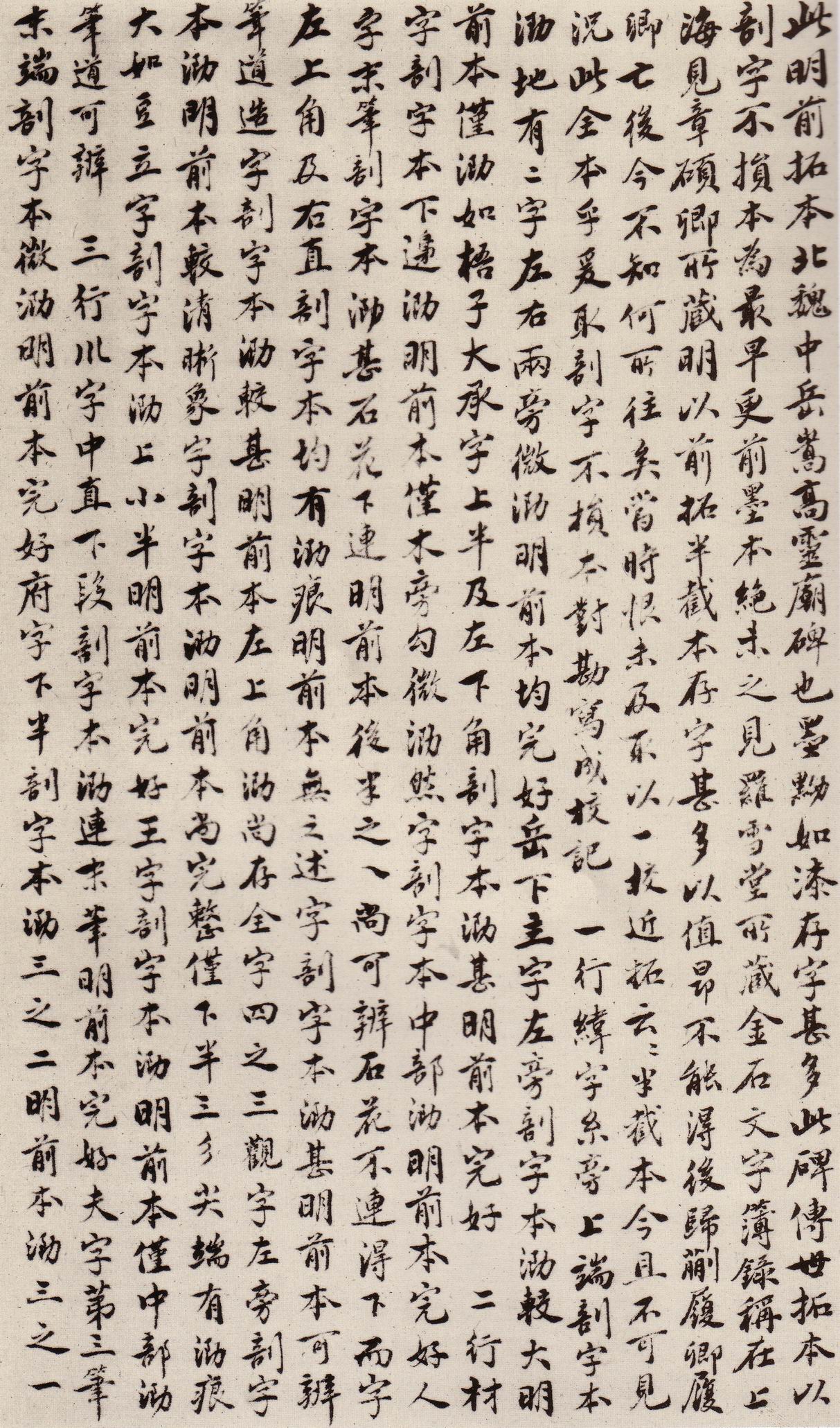 《中岳嵩高灵庙碑》虽放纵,但风格极高浑雄大,笔力沉静,具有一种森严之妙趣。此碑与《大代华岳庙碑》文字大致相同,仅将中间有关嵩华词句,互相掉换。