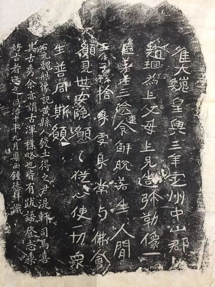 这尊佛像出土后,被送到黄县城隍庙佛堂供奉。同治十年(1871),黄县知县尹湜轩纂修县志,想找来这尊佛像拓制造像题记,派人到城隍庙,佛像却已不见踪影了。后来查访,才知道是被一个姓董的恶徒偷走,以五十千文的价格卖给了蓬莱张氏。喜好古物的黄县丁氏“泰来”掌门人丁树桢听说后,遂原价买了过来。知县尹湜轩也是好古之人,就让好友钟德祥在佛像背面题跋:“右元魏造像记,黄县人发土得之,尹湜轩司马喜其古秀,余亦谓古浑朴略也,皆有跋语登志乘,好古者宝之。同治十年九月,粤西钟德祥识。”著名学者王守训对钟德祥在这珍贵佛像上题跋一事曾耿耿于怀,他在《登州杂事》里记道:“而为一南人加跋语于后,词近敷衍。”