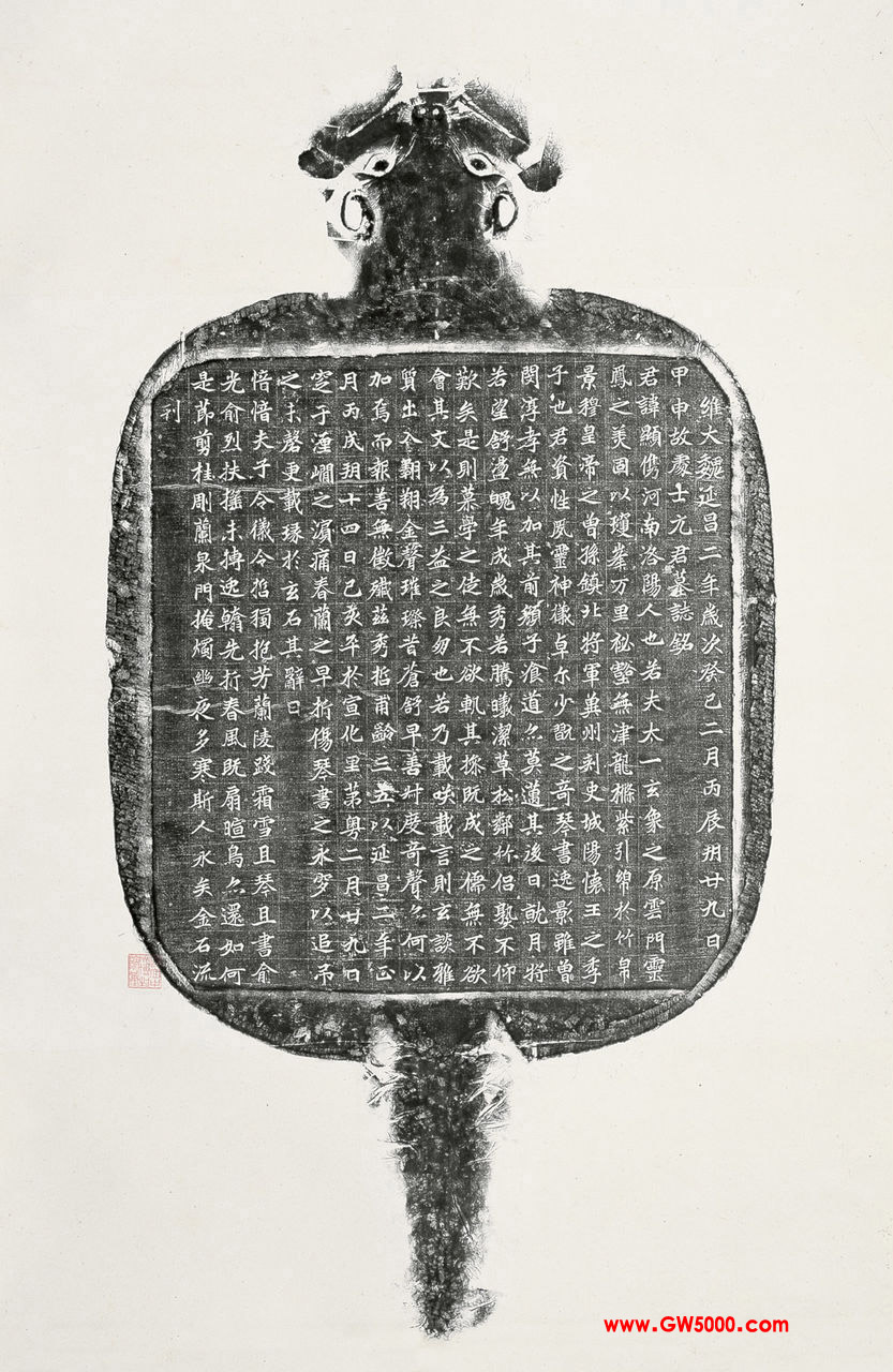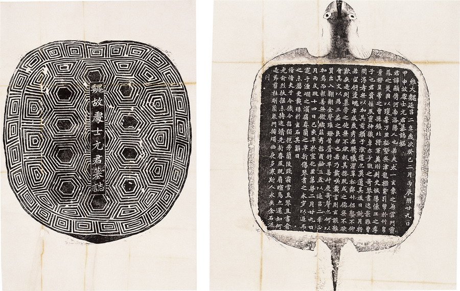 此志石灰石质,通高35厘米,长75厘米,宽56.5厘米。上面为志盖,用阴线刻满四边形、五边形、六边形的龟甲纹样,龟甲中央阴刻正书“魏故处士元君墓志”八个字。下面镌刻着正书志文,计十九行,行二十一字,共三百五十七字。志盖和志文上下相合,正好为一个生动、完整的石龟,而且龟的首尾、四足毕具。把墓志制成象征长寿的龟形,祈求墓主在九泉之下得其永年。这一形制,在北魏墓志中为仅见,后世也极少出现。