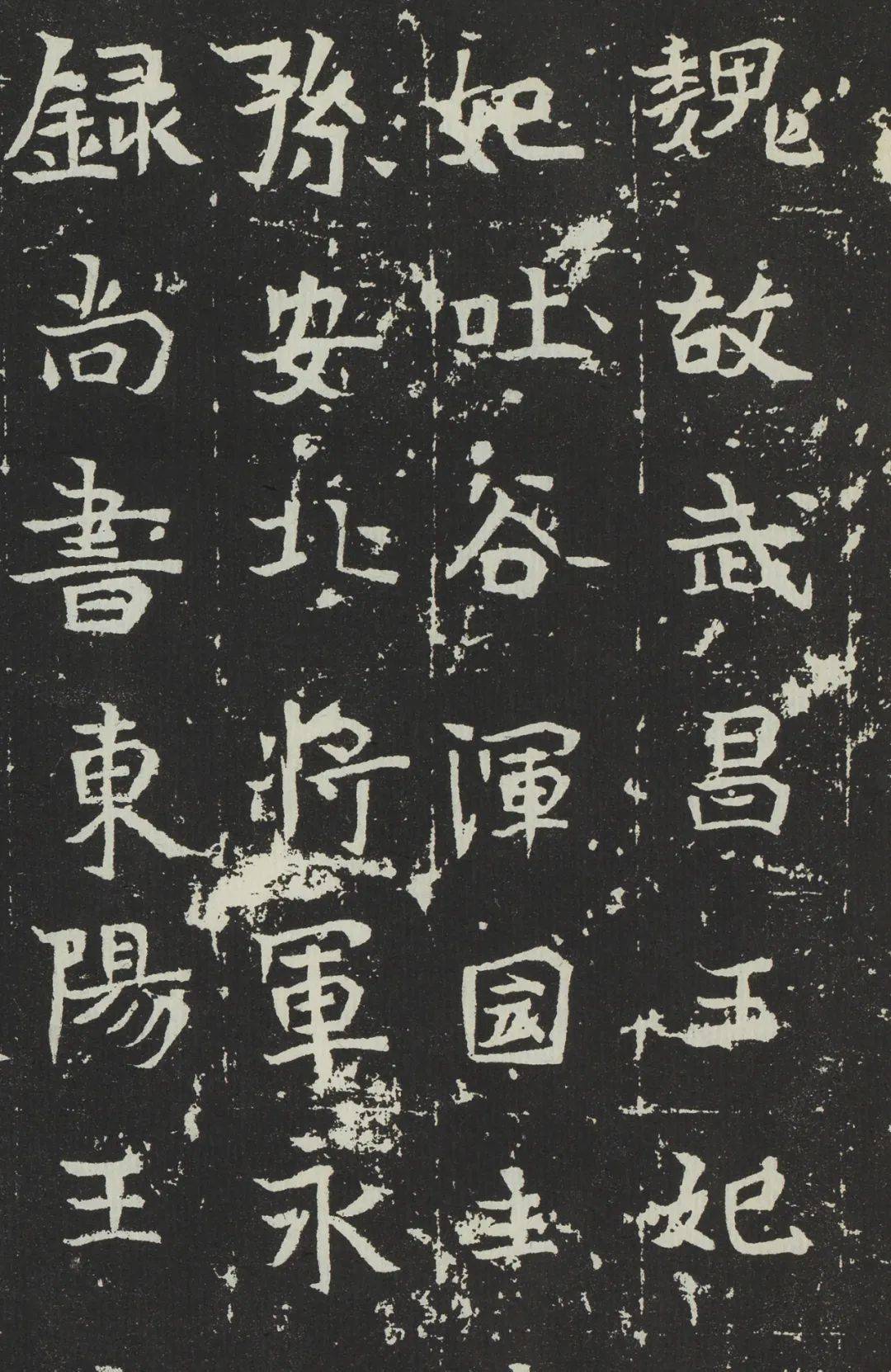 【释文】魏故武昌王妃吐谷浑氏墓志铭妃吐谷浑国主冑胤,安西将军永安王斤之孙,安北将军永安王仁之长女,太尉公三老录尚书东阳王之外孙。魏建义元年七月三日,薨于崇让里第。粤八月十一日迁期同窆王陵。实亦痛感有识,哀惊朝野,思铭德音,用贻来叶。其辞曰:开元巨冑,系绪干方,后流未极,弈世载昌。其宗唯帝,厥考伊王,兰枝散馥,桂胤垂芳。六行外显,四德内彰,金华比耀,玉质承光。双娥伫映,素体风霜,媛德雍雍,婌问济济。涉月怀春,游汉思礼,百两来仪,终远兄弟。同车去国,作嫔魏庭,行未半古,中年分体。贞心遂远,慎性方愈,从□独守,茞帐空居。衰容去镜,蓬发辞梳,悲眷夜景,泣对晨孤。锦衾晦卷,□□明舒,终言悴绶,奄焉沦诸。荒凉松夕,萧瑟泉扃,来云闇色,去鸟悲声。烟凝楚室,水激寒庭,杨原稍故,幽遂长冥,玄石无刊,焉寄斯贞。建义元年八月十一日。