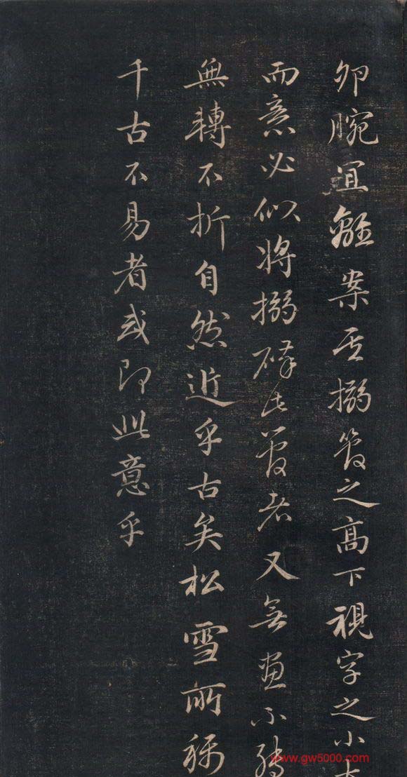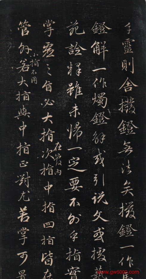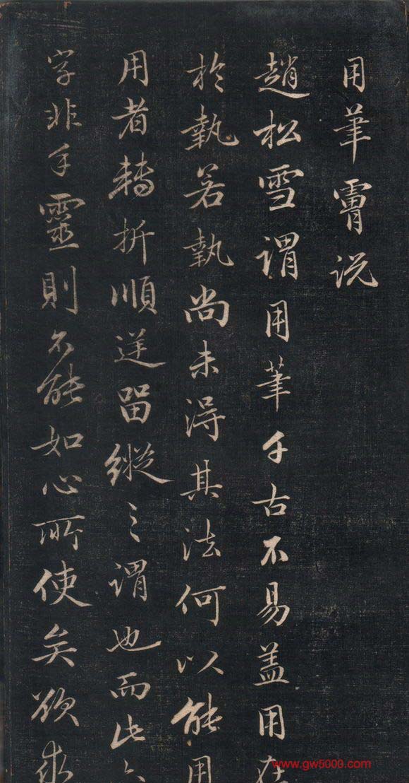 赵松雪谓用笔千古不易。盖用在于执,若执尚未得其法,何以能用,用者转折顺逆留纵之之谓也,而此六字非手灵则不能如心所使矣,欲求手灵,则含拨镫无法矣。拨镫一作马镫解,一作烛镫解,或引说文,或据艺苑诠释,虽未归一定要,不外乎指实掌虚之旨,必大指在管内,次指、中指、四指皆载管外,小指不用。若大指与中指正对,尤善。掌可置卯,腕宜离案,其搦管之高下视之小大,而意必似将搦碎此管者,又无尽不缚无转不折,自然近乎古矣。松雪所称千古不易者,或即此意也。