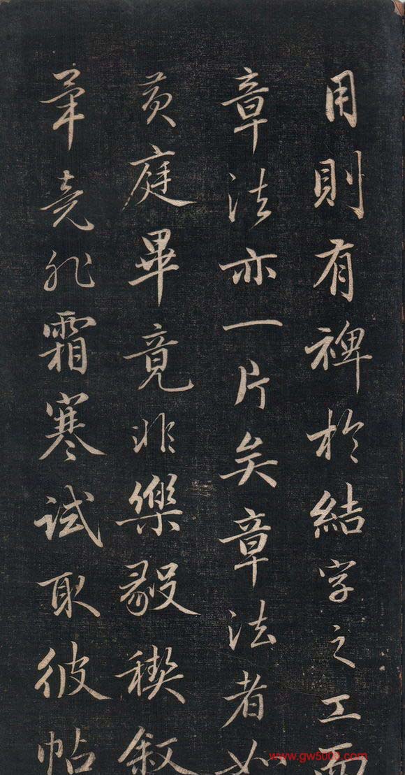 结字何有定法,昌黎论文谓气盛则言之短长与声之高下皆宜。字亦犹是也。学至则体之密疏、圆方、阔狭悉称矣。然又有自古不易者,昔沈存中尝论其大概,以为笔画少者在左宜取上齐,如吟、啼、等字。笔画少者在右宜取下齐,如扣、猒等字。凡斯之类可偶反也。又如山字中画必不可长,穴字中点更不可大。与其太整毋宁稍欹,如乐、无等字。与其过均,毋宁稍变,如圭、会等字。若此之类又未可用则有裨于结字之工而章法亦一片矣。章法者,如黄庭,毕竟非乐毅、稧叙。毕竟非霜寒,试取彼帖一两字入此帖中,固不相变也,而况一纸之上,或欧或颜,忽苏忽赵乎?至于大字收令小,小字展令大之,更仆终也。及夫意得神行,韵胜古化,触手成趣,心字相忘,孰为肥瘠,何谓妍媸。前之所陈蹄捐筌弃已耳。抑有进者欧非褚也,米非苏也,颜柳非鲜有赵也。笔势既殊,体制迥别,最当详辨,不宜挽二言。虽传自唐贤,窃所不取不几于截鹤续凫耶。