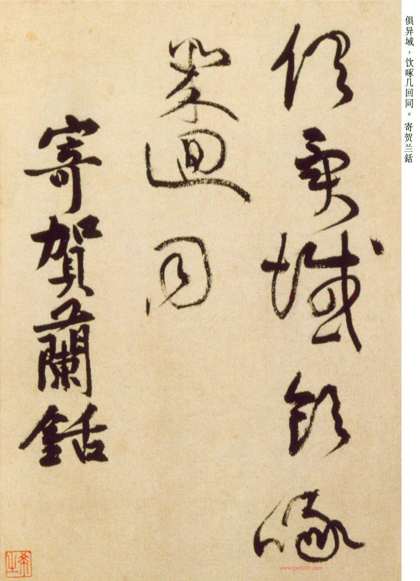 释文:朝野欢娱后,乾坤震荡中。 相随万里日,总作白头翁。 岁晚仍分袂,江边更转蓬。 勿云俱异域,饮啄几回同。寄贺兰铦