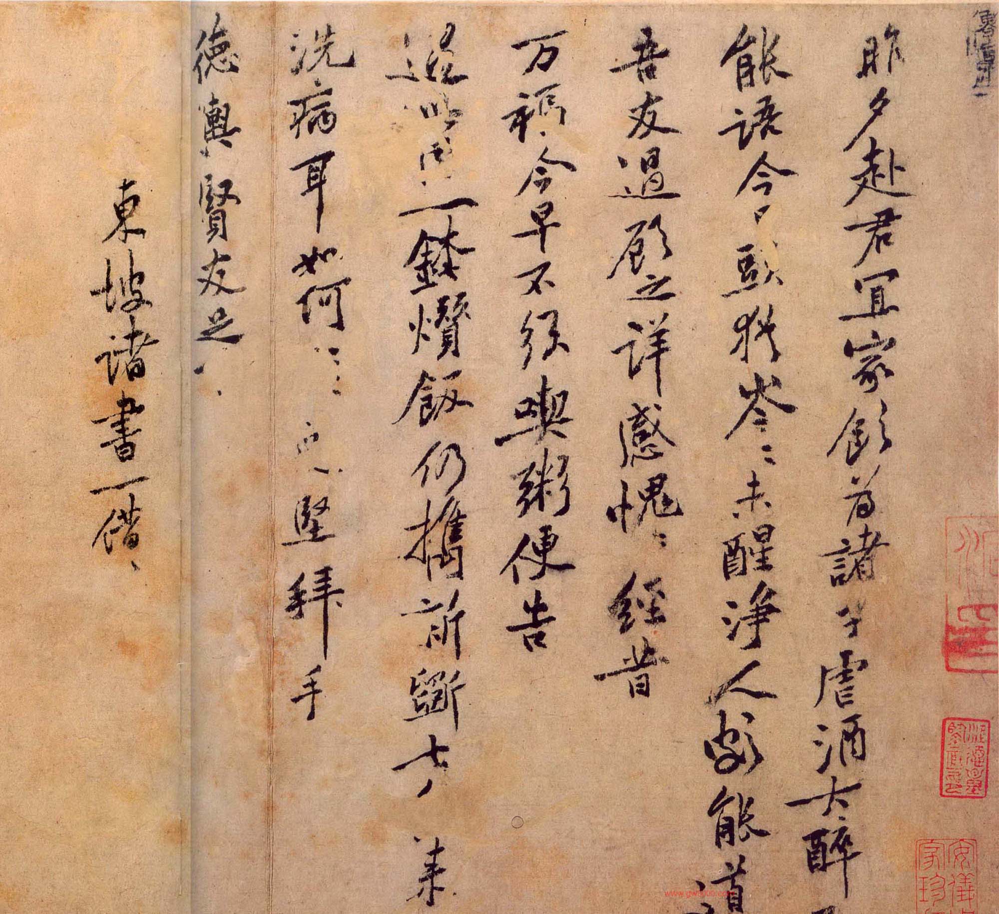 此帖是黄山谷写给友人德舆的便札,告知其病酒之事。该帖因系酒后“大醉”,一宿“未醒”之时所书,所以笔画与平时有别,颇显颤抖衰颓,间有残破处,显得精神稍逊,但字间紧凑,行间宽松,欹侧之势,依然是黄书本色。
