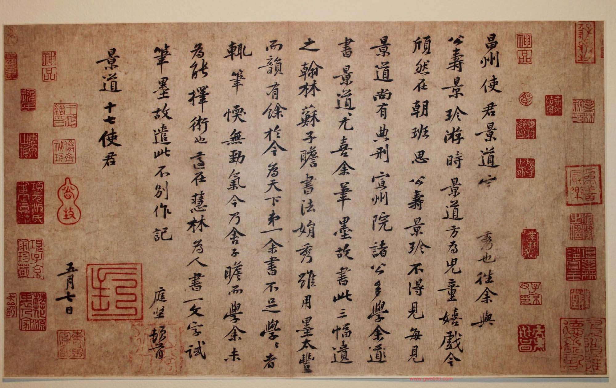 黄庭坚行书欣赏《致景道十七使君书》,纸本。信札一则,纵27.8厘米,横47.4厘米。台北故宫博物院藏。