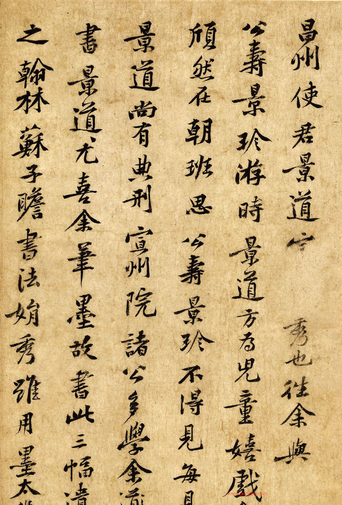昌州使君景道。宗秀也。往余与公寿景珍游。时景道方为儿童嬉戏。今颀然在朝班。思公寿景珍不得见。每见景道。尚有典刑。宣州院诸公多学余[道]书。景道尤喜余笔墨。故书此三幅遗之。翰林苏子瞻书法娟秀。虽用墨太丰。而韵有余。于今为天下第一。余书不足学。学者辄笔愞无劲气。今乃舍子瞻而学余。未为能择术也。适在慧林。为人书一文字。试笔墨。故遣此。不别作记。庭坚顿首。景道十七使君。五月七日。