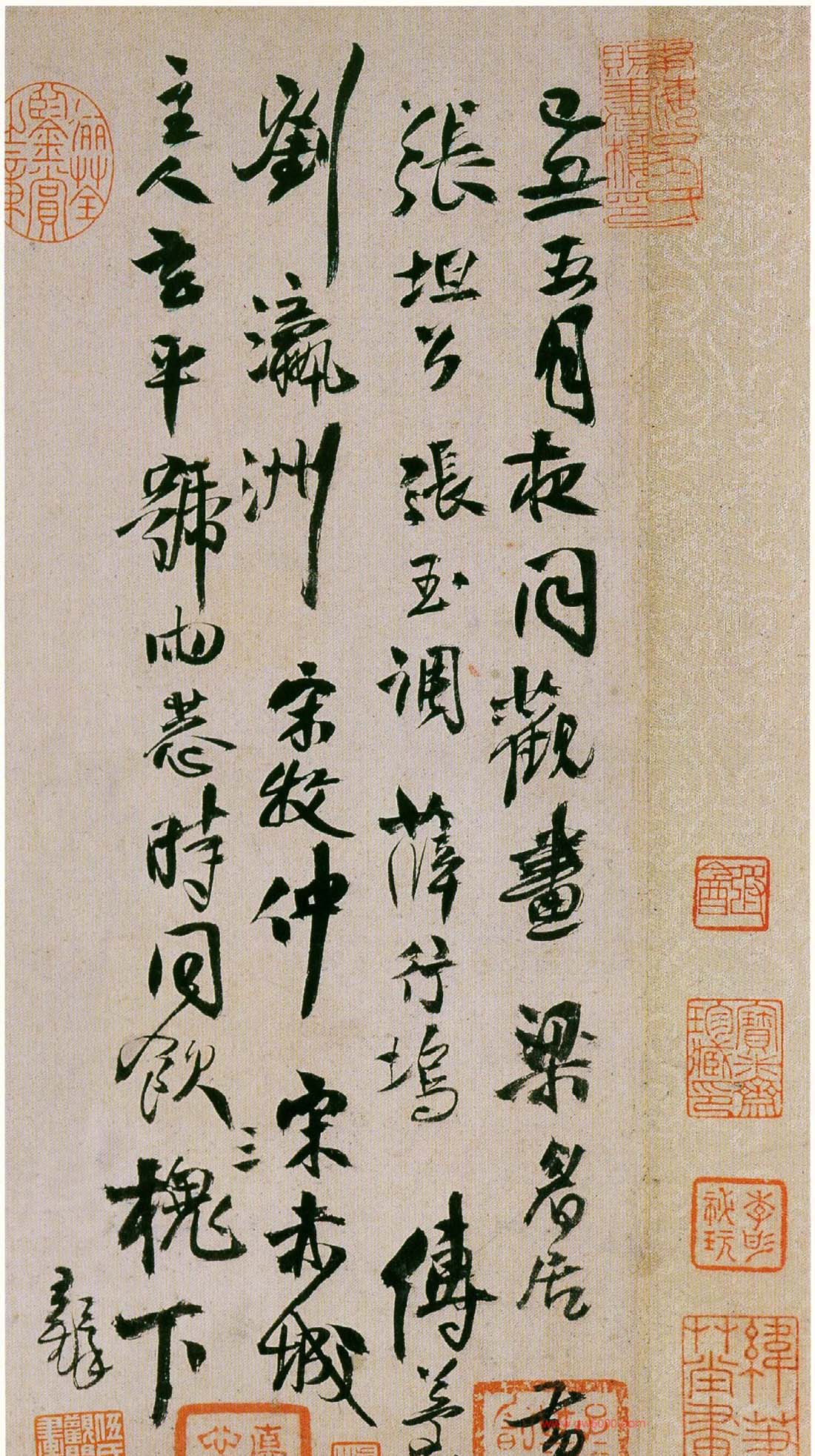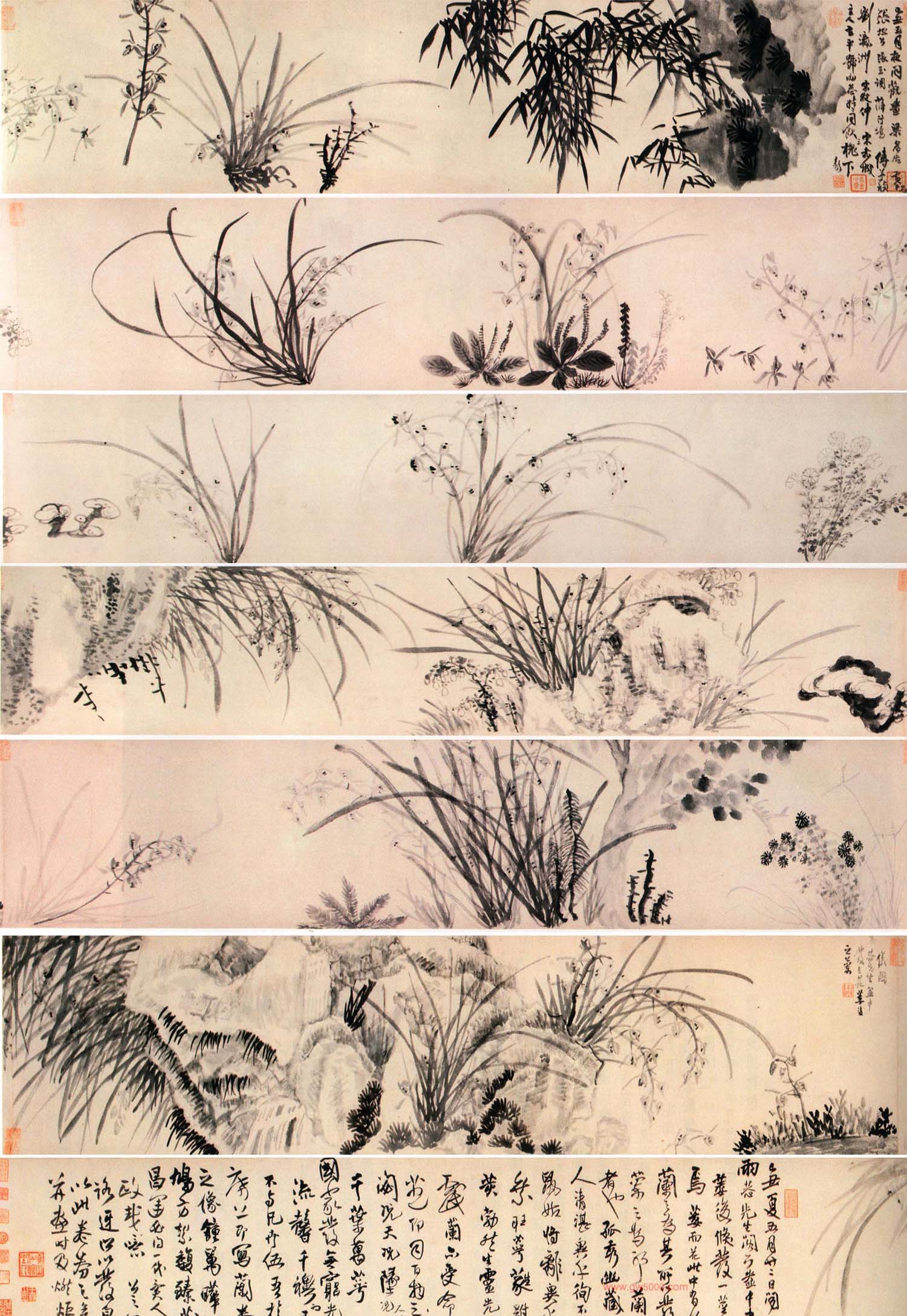 王铎行草书精品《枯兰复花图跋帖》全卷32.6X1035.5cm。1649年作,苏州博物馆藏。舒卷而精致,纵逸而蕴藉,为王铎晚年行草书之精品。