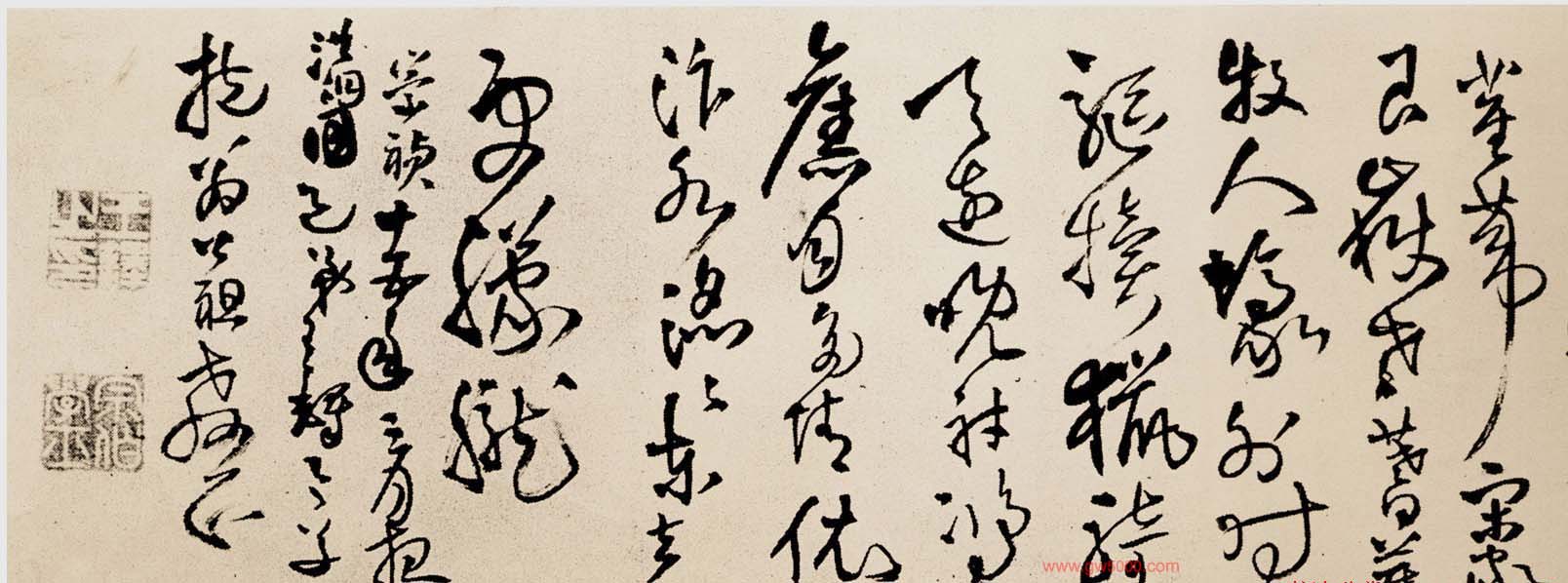 王铎《赠张抱一草书诗卷》自署书于崇祯十五年(1642)。绫本。草书。日本东京国立博物馆藏自作诗七律五首·凡七十五行,共3636字。横469厘米,纵26厘米。