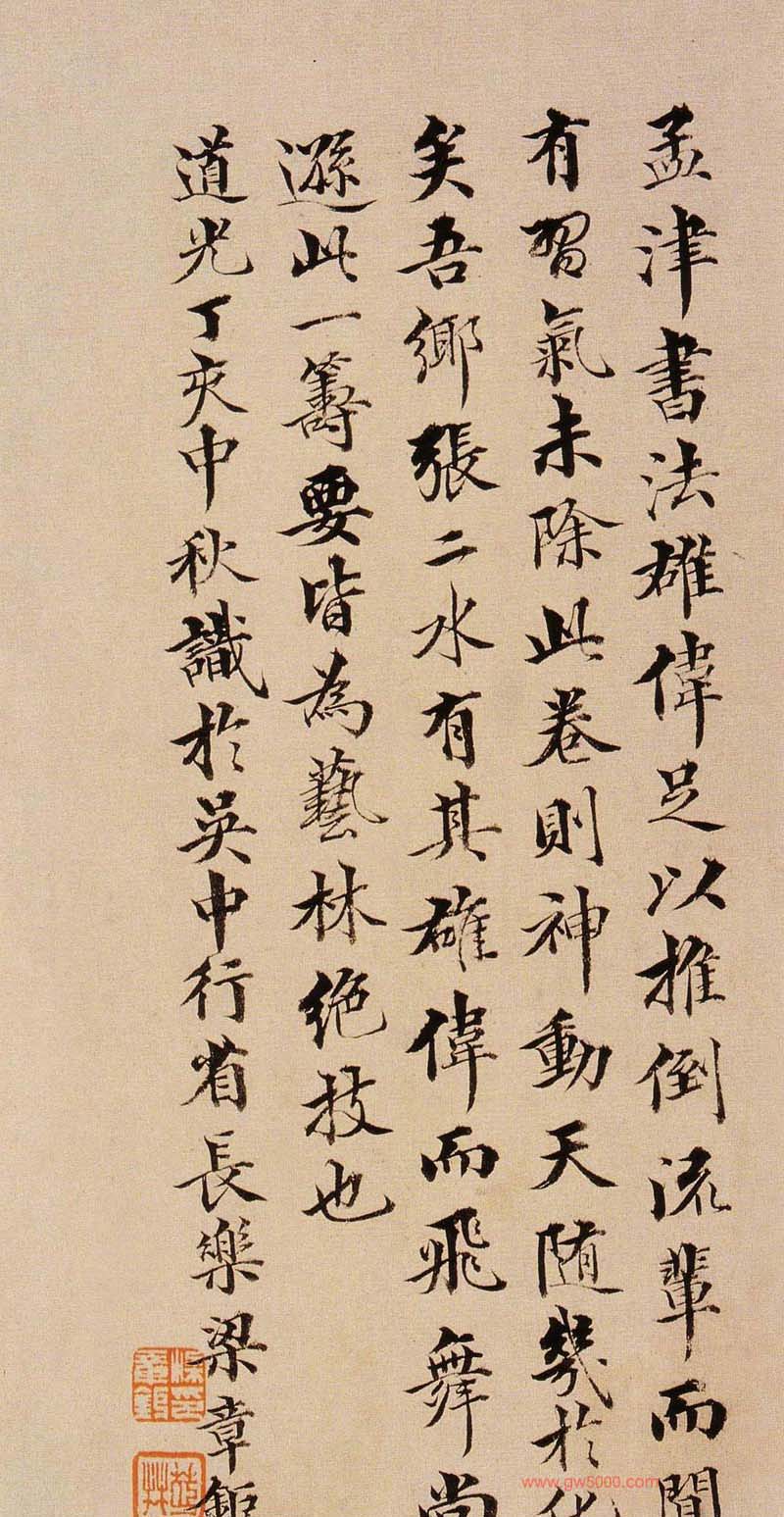 释文:当秋暮雨烟欲飞鹤来亭树 携榼登啸殊开清兴 眼明游华林园有称此中宜奏盛乐 太子初无言但咏古今冲 诗曰何必丝与 竹山水有清音虎丘烹茗邀 琴客弹南风联袖徜徉看云霞 摇动便自悠然有欲 当日有好怀袖手 哦古人诗云其青 山秀水到眼即可舒啸何必居篱 落下然后为亡物 寂居荒凉草树茂密居无骡马 因与人绝一 室之内可以自娱 夏日荷发水槛香来展玩古迹 泼墨写远山此侨胸怀磊落 视五侯池馆笙歌真成草头露 柳覆 茅楹拥书高卧北窗清风 来何须让渊明为羲皇上人 地白霜清吟啸兴怀想天际真人 觉一切浓淡是非都可度外 处之 安可攒眉屋子下郁郁然也 梧桐叶落远岫云浮飘然寄傲 第一清福唯韵人自领受耳 唐伯虎居吴驾小舫 书画琴鹤往 来游赏后贫作乞于寺人不知其大狂 高隐为玩世逸流 得意花供数枝好友高谭世外事 抱膝把酒 看西山爽气听钟声 至耳安能不畅然于中耶 綗卿年兄冲襟雅度文藻烟云人 知为文士也不知其肝胆异常骨力 特劲饶经济之才而运以浑雅素 为莫逆交远寄此卷索书时治装刻 下起行呼书奴立而竣之并跋此道 我辈一段精神耳 甲子暮春洛下王铎