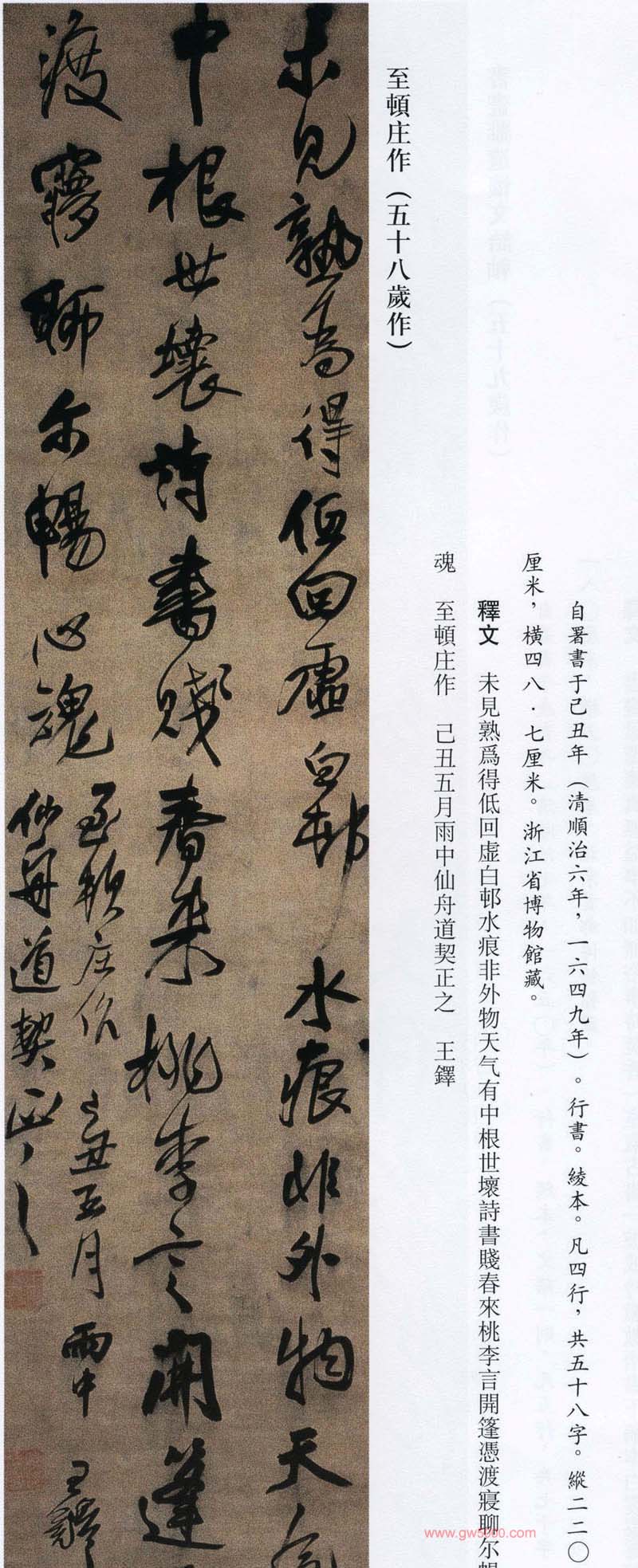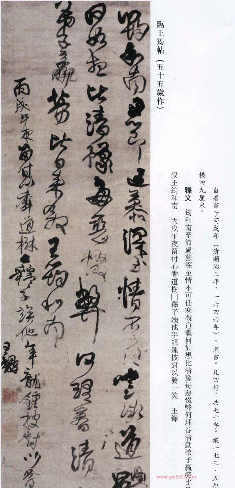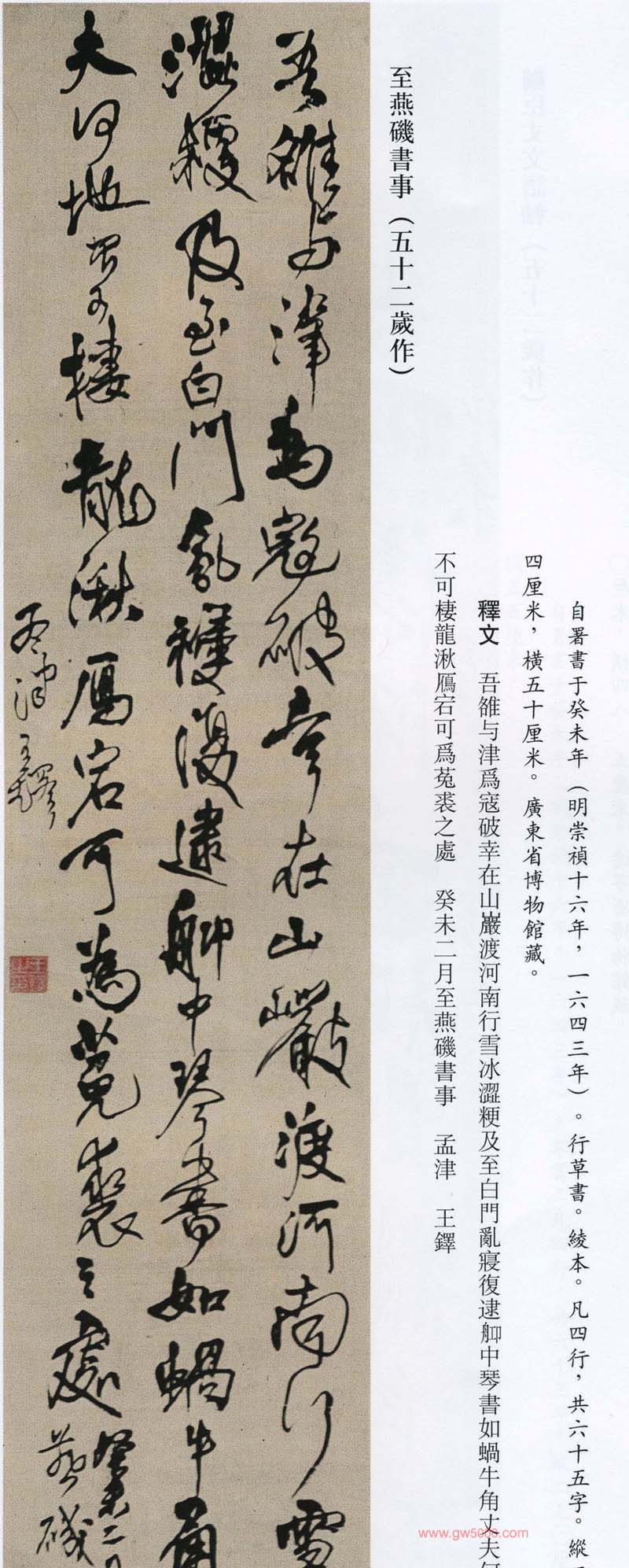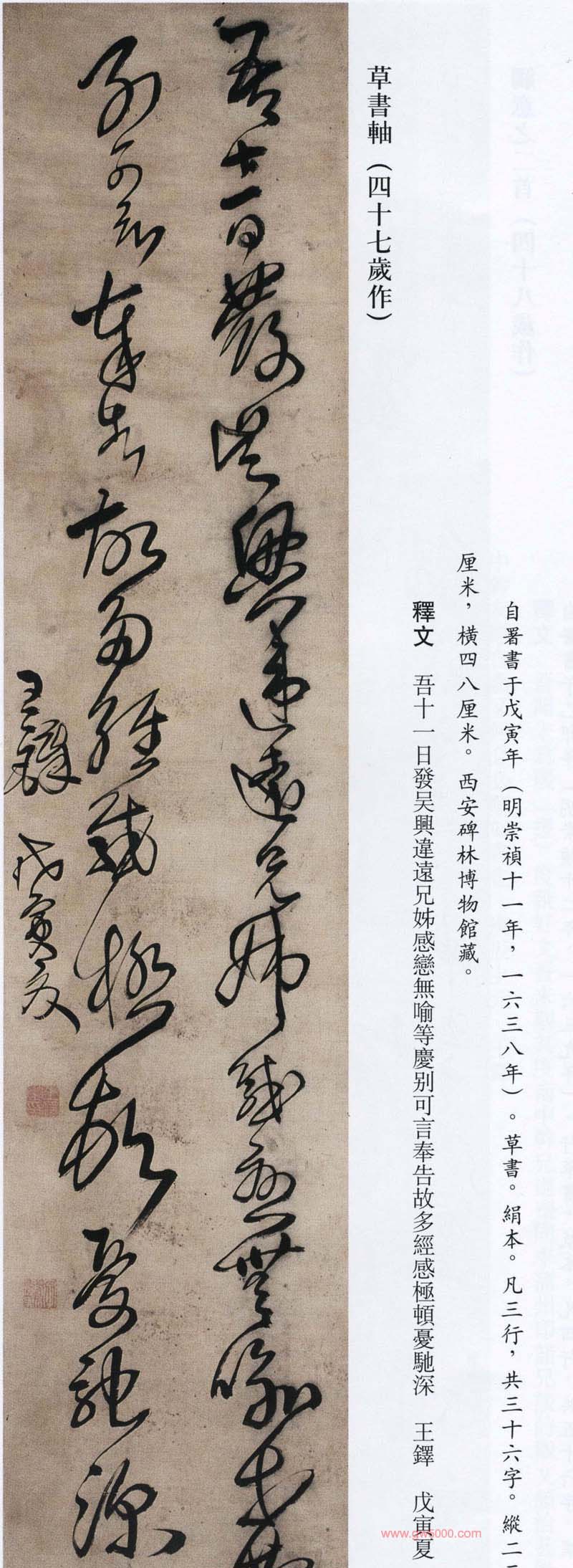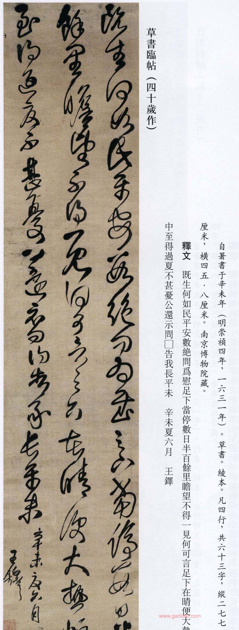 王铎(1592--1652)字觉斯,一字觉之。号十樵,孟津(今河南孟津)人。铎博学好古,工诗文。尤其以书法独具特色,行草宗二王,正书师钟繇,亦多自出胸臆,世称“神笔王铎”。他的书法与董其昌齐名,明末有“南董北王”之称, 他书法用笔,出规入矩,张弛有度,却充满流转自如,力道千钧的力量。王铎擅长行草,笔法大气,劲健洒脱,淋漓痛快,戴明皋在《王铎草书诗卷跋》中说:“元章(米芾)狂草尤讲法,觉斯则全讲势,魏晋之风轨扫地矣,然风樯阵马,殊快人意,魄力之大,非赵、董辈所能及也。”