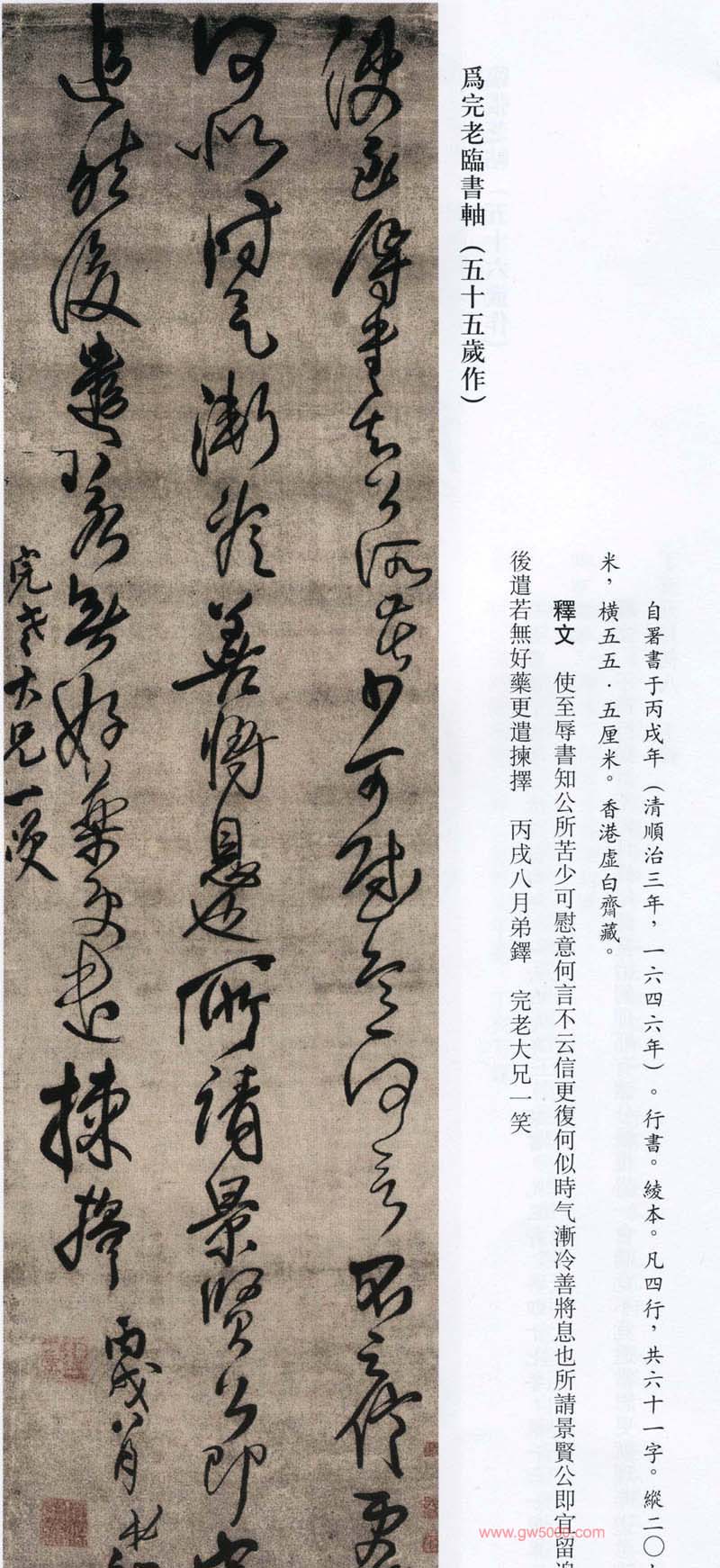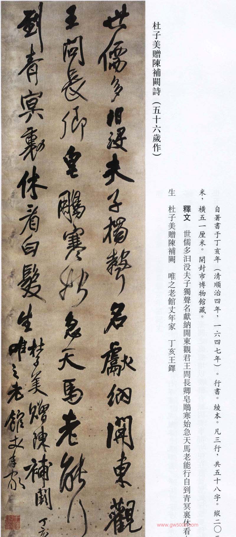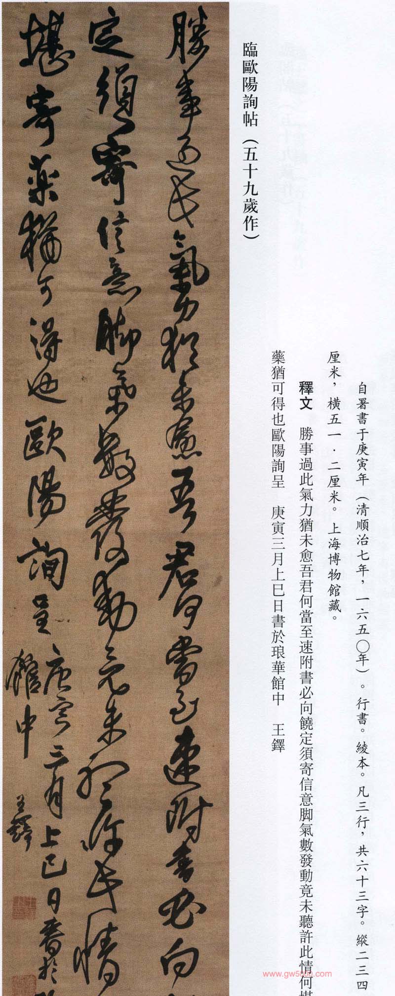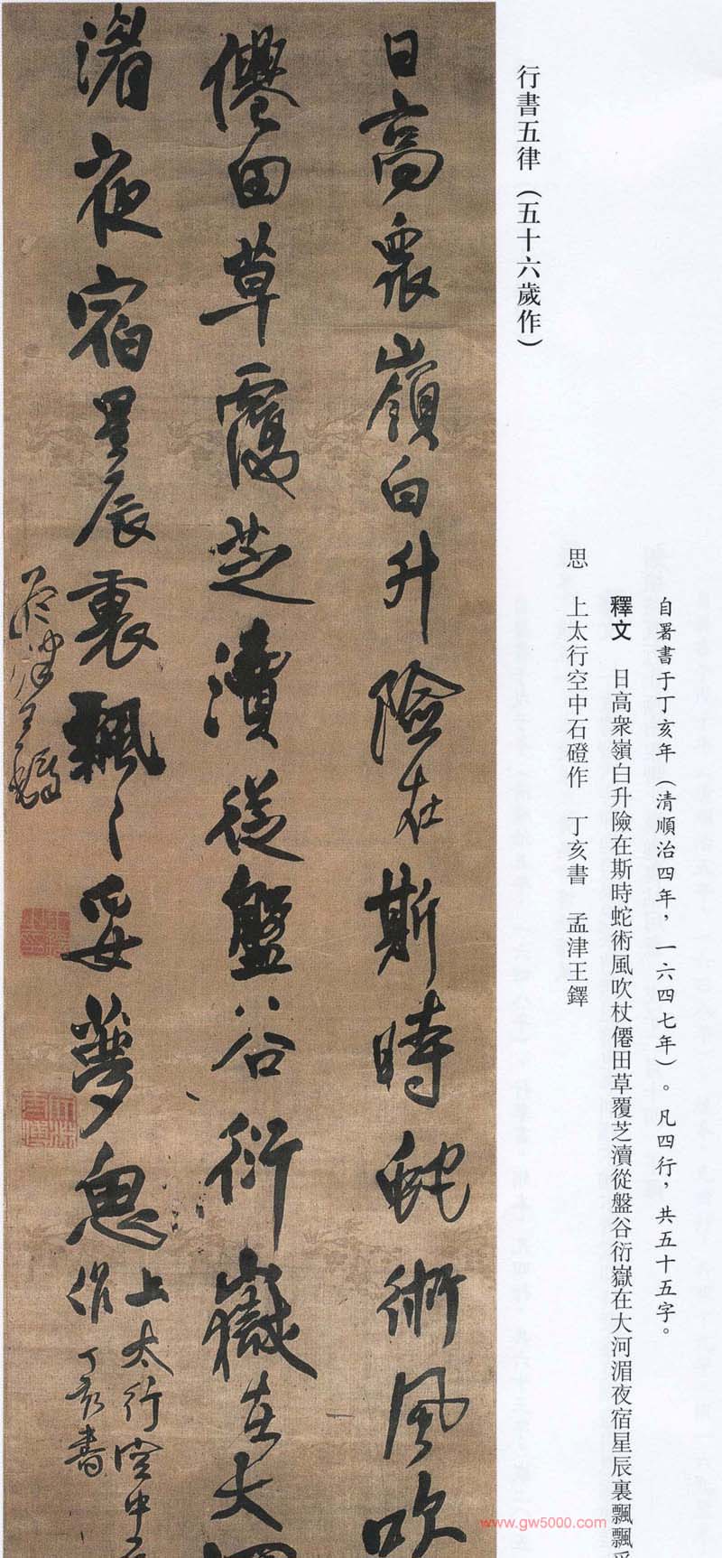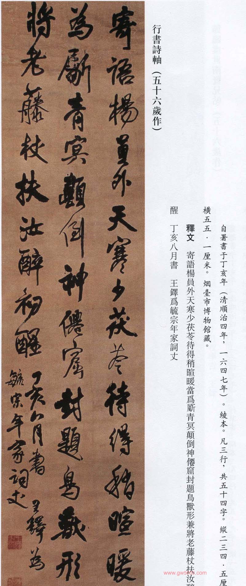 王铎(1592--1652)字觉斯,一字觉之。号十樵,孟津(今河南孟津)人。铎博学好古,工诗文。尤其以书法独具特色,行草宗二王,正书师钟繇,亦多自出胸臆,世称“神笔王铎”。他的书法与董其昌齐名,明末有“南董北王”之称, 他书法用笔,出规入矩,张弛有度,却充满流转自如,力道千钧的力量。王铎擅长行草,笔法大气,劲健洒脱,淋漓痛快,戴明皋在《王铎草书诗卷跋》中说:“元章(米芾)狂草尤讲法,觉斯则全讲势,魏晋之风轨扫地矣,然风樯阵马,殊快人意,魄力之大,非赵、董辈所能及也。”