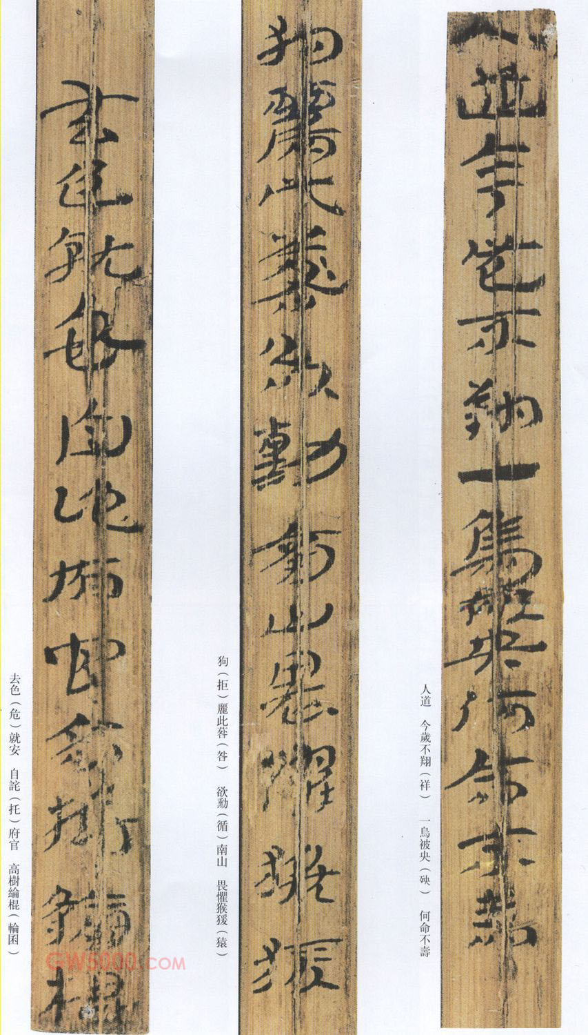 今歲不翔(祥),一烏被殃。何命不壽,狗麗(遘罹)此□(咎)。欲勛(循)南山,畏懼猴猨。去色(危)就安,自詫(詑)府官。高樹綸棍(輪囷),支(枝)格相連。府君之德,洋洫(溢)不測。仁恩孔隆,澤及昆虫。莫敢摳去,因巢而處。为狸□(狌)得,圍樹以棘。