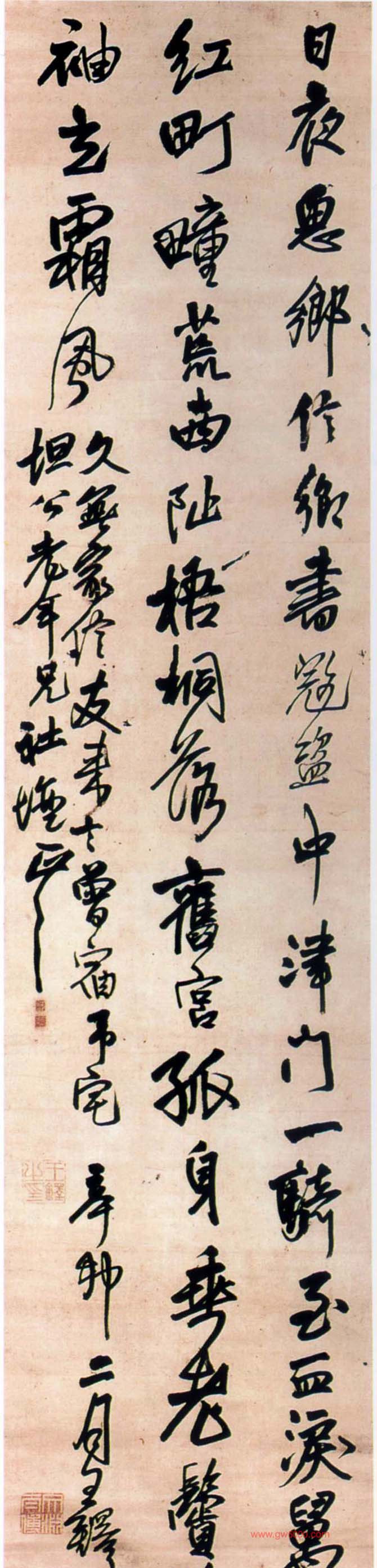 王铎行书作品欣赏《日夜思乡信五言律诗》立轴绫本,纵234cm,横51.4cm。北京故宫博物院藏。