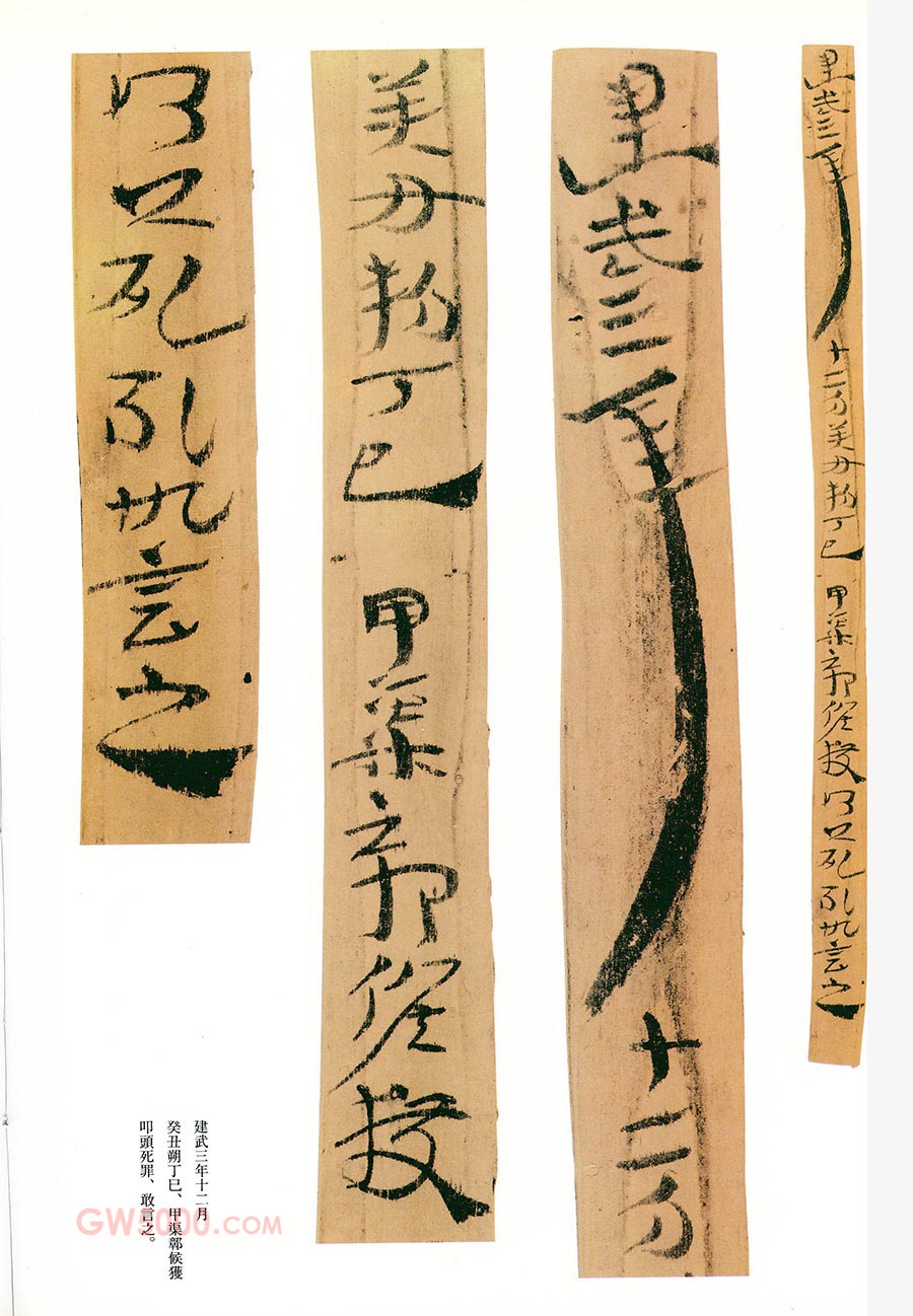又称《死驹劾状》《隧长焦永死驹劾状》,书于东汉光武帝建武三年(公元27年),章草隶体。1974年出土于居延甲渠候官遗址第 22 号房址内。共 16 简,木质,长 21.2—23厘米,宽 0.9—1.1 厘米。除一枚略有残蚀外,其余各简均清晰如初。全篇章草,一气呵成,潇洒飘逸,既是一篇重要文献,又是一幅书法珍品。可释读者 409 字。文义连贯,内容完整。第一枚为题签,第二简以下为正文,简背有书吏之签署。内容是一份追查死驹责任的文书。编号为:居延新简EPF22:186— 201。现藏甘肃省简牍博物馆。《书法》杂志、《中国美术全集》书法篆刻篇(1)、《行草-书法自学丛帖》均有刊载。