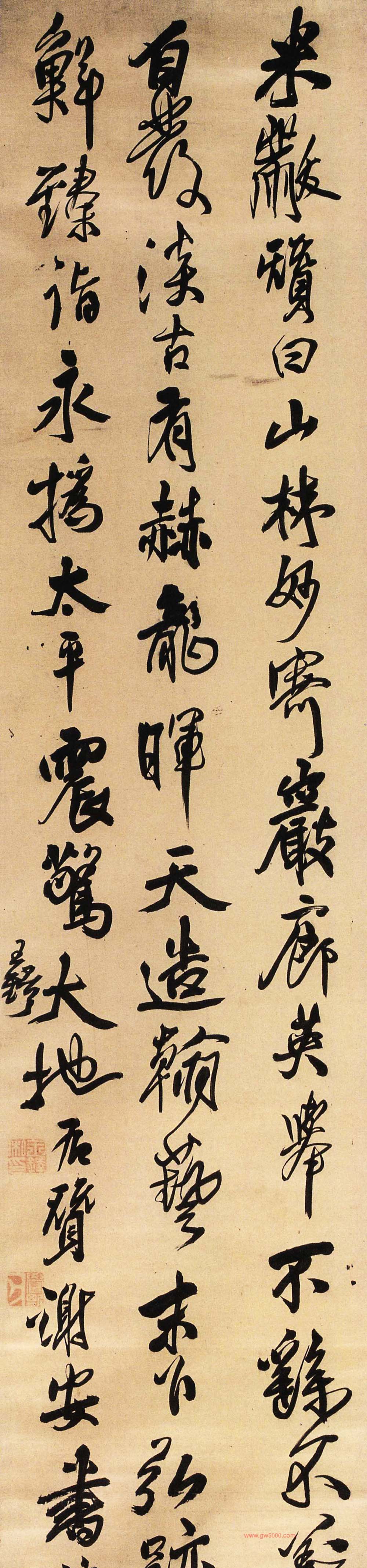 王铎行草书立轴欣赏《赞谢安书轴》绫本,纵236.6厘米,横52.2厘米,清顺治八年辛卯(1651)七月一日,于旅途中,觉斯时年60岁作《临谢安帖轴》。安徽省博物馆藏。