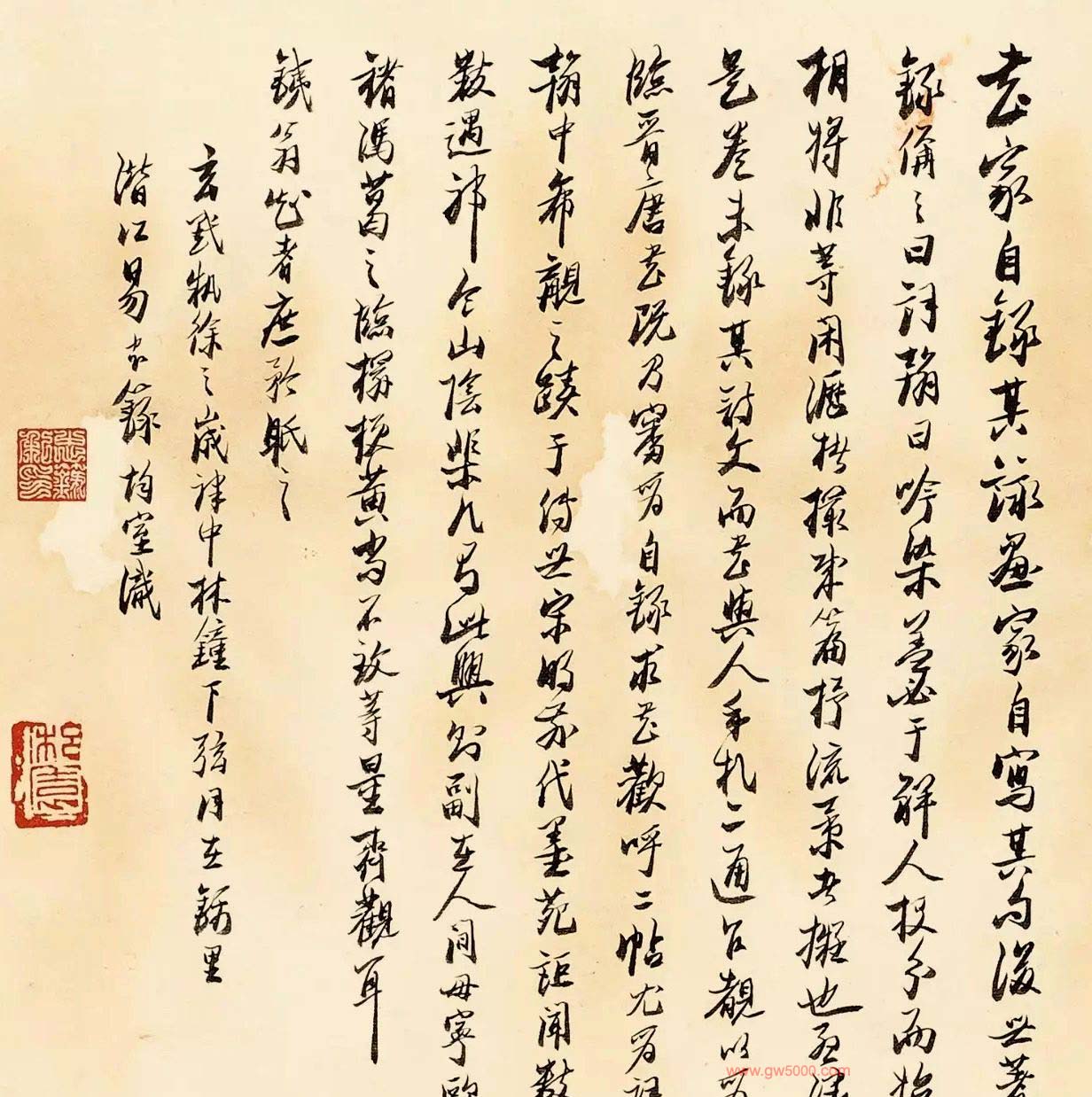 书家自录其咏,画家自写其句,后世著录称之曰翰墨、曰吟染,盖必于解人投分而始相将,非等闲沥楮,撮成篇抒流策者拟也。孟津是卷,未录其诗文,而书与人手札二通,乍覩以为临晋唐书,既乃审为自录求书、欢呼二帖。尤为词翰中希觏之迹,于传世宋明前代墨苑讵闻数数遇耶。今山阴棐几有此兴,则副在人间,毋宁欧褚冯葛之临拓硬黄,当不致等量齐观耳。铁翁知者庶矜眂之。玄黓执徐(1952年)之岁律中林钟下弦月在锦里,潜江易忠箓均室识。