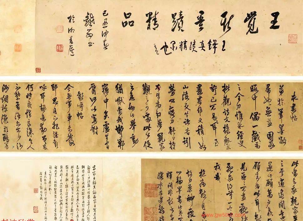 王铎行草书法手卷《求书帖+欢呼帖》,水墨绫本,26.5×182.5cm。