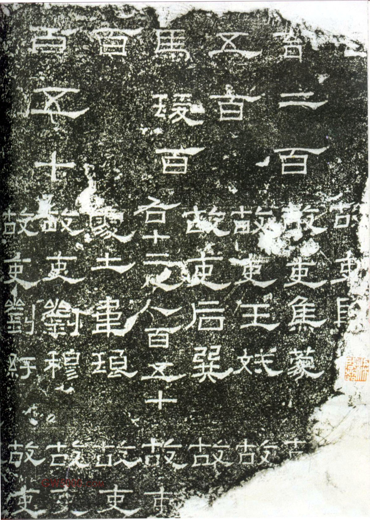 阳嘉残碑,东汉阳嘉二年刻,清光绪元年出土于曲阜,碑阳存10行,碑阴存3列。用笔精到,波笔突出。