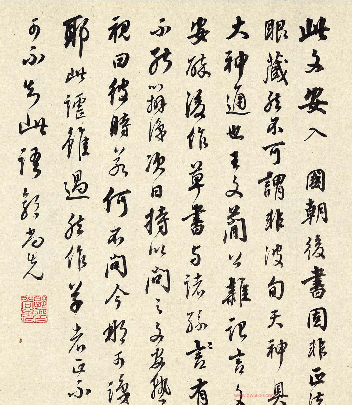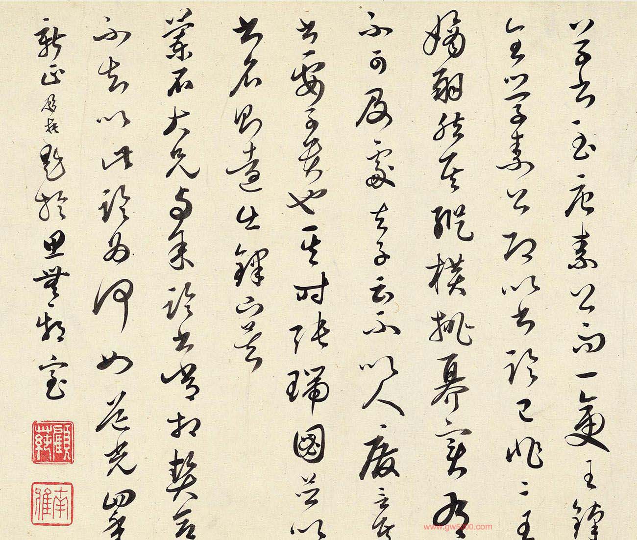 郭尚先书法题跋:此文安入国朝后书,固非正法眼,藏然不可谓非波旬天神,具大神通也。王文简公杂记言,文安醉后作草书与诸孙,有不能辨识,次日持以问之,文安熟视曰,彼时若何不问,今那可识耶。此□虽过,然作草者正不可不知此语。郭尚先。