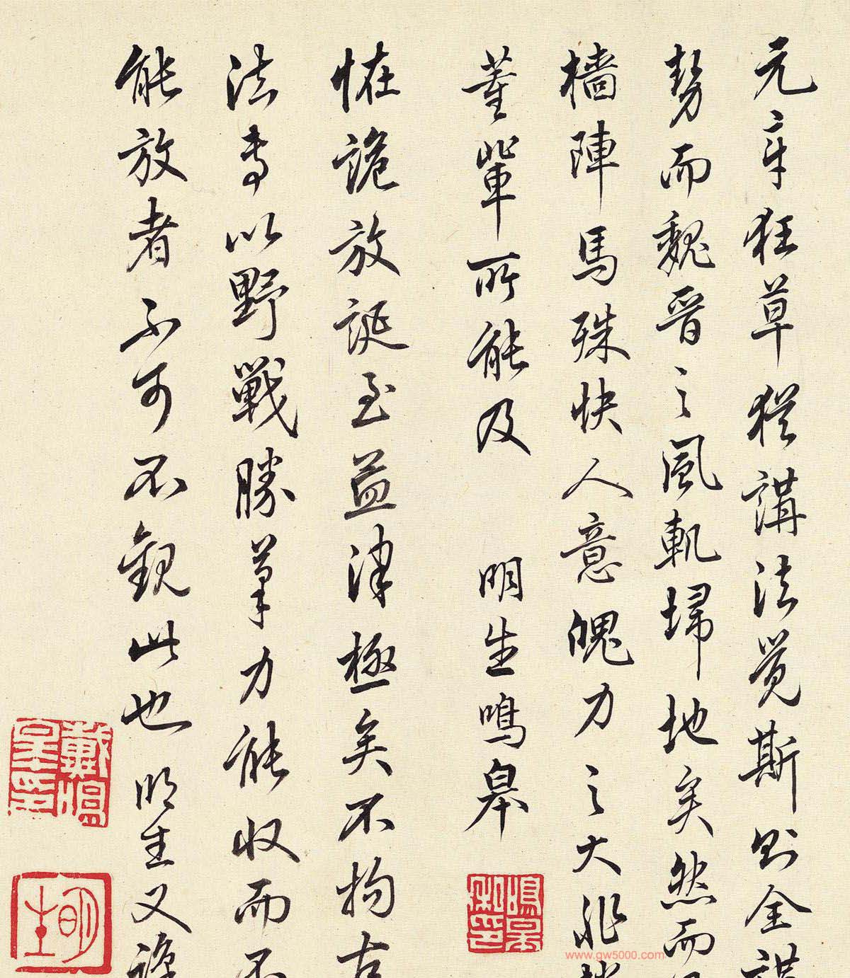 戴鸣皋书法题跋:元章狂草犹讲法,觉斯则全讲势。而魏晋之风?埽地矣。然而风樯阵马疏快人意,魄力之大非赵董所能及,明生鸣皋。