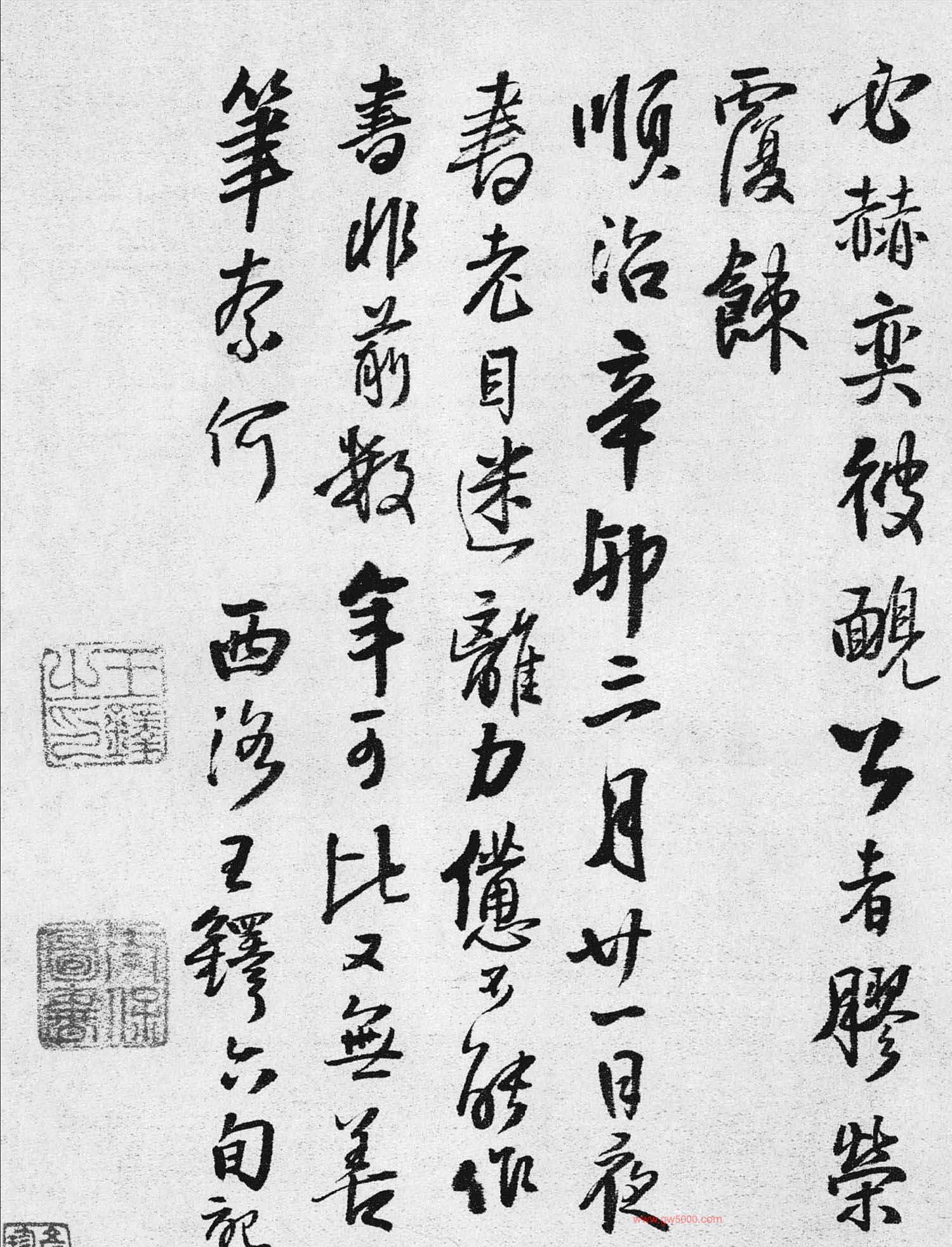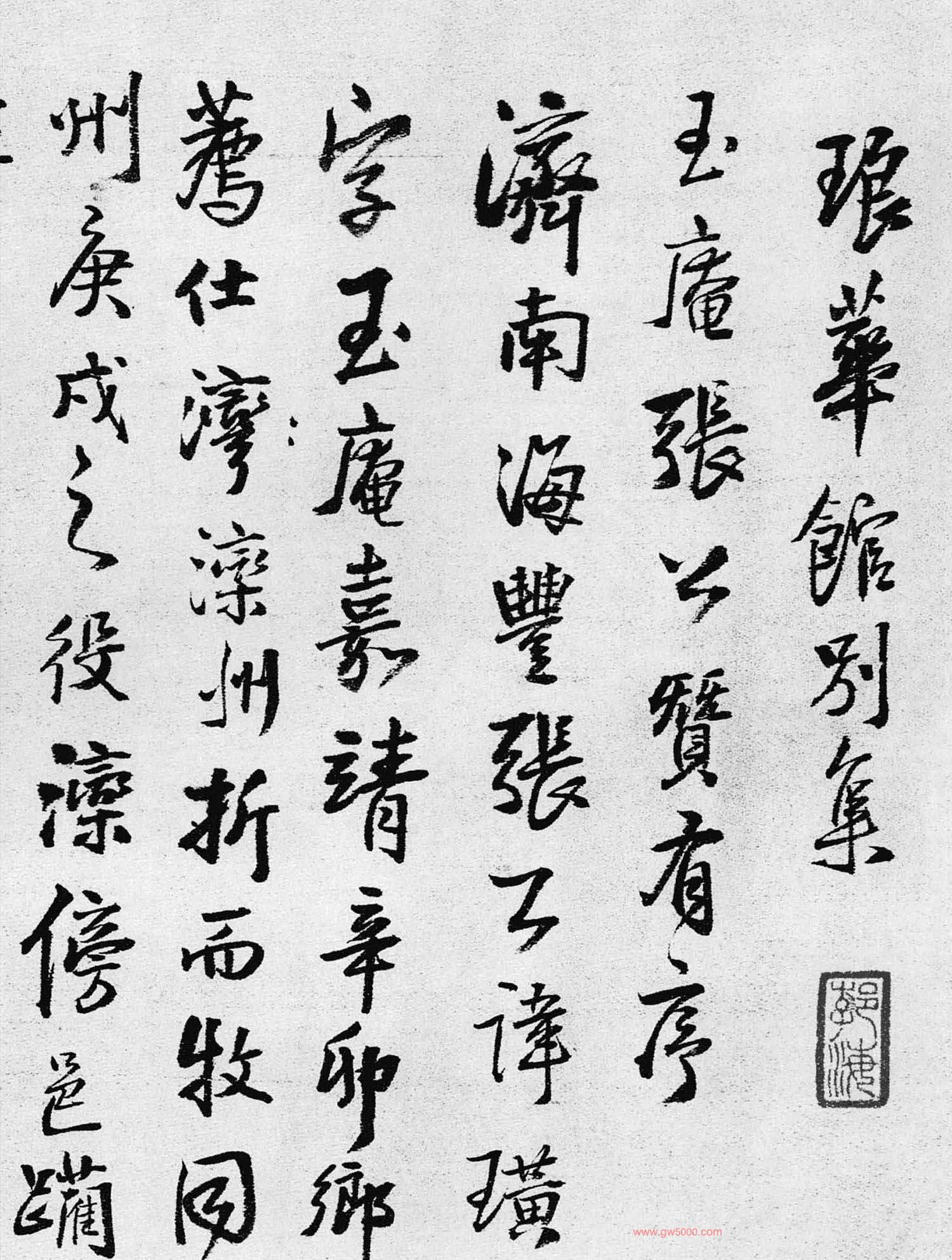 琅华馆别集。玉庵张公赞有序。济南海丰张公,讳璜,字玉庵。嘉靖辛卯郷荐仕(湾)滦州,折而牧同州。庚戌之役,滦傍邑躏,无不惊。公能备,不示之弱,滦以整也而不衂。河淤,公濬焉,障堤不但免于鱼祸,无断堰沽沟啮崩之害。田则登无凋。鄢懋卿为御史,诡词梯赂,公志不淫,竟无所私餽。会当陟,遂以同州抑公,公昂首伸眉挂冠去。今滦人岁祠之,若玉庵公得不谓之无官谤乎。噫!孤行一意者,何尝绌于物哉。其孙逸有直声。王铎赞曰:处静不譁,内审鲠骨。滦无卤略,公闲孔武。河不割人,穀粒允活。狐貙噉贿,公抗罔挫,宁撄哮怒。坚金何蝕,拄天无仄。洗谅昭直,未大弘晖。后必赫奕,彼腼公者,胶荣复餗。顺治辛卯三月廿一日夜书。老目迷离,力憊不能作书,非前数年可比。又无善笔,奈何!西洛王铎六旬记。