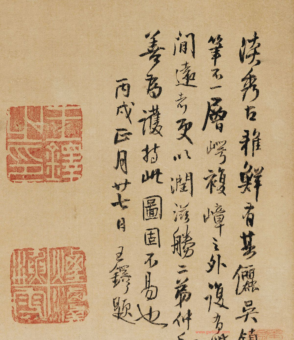 淡秀古雅,鲜有其俪。吴镇笔不一,层崿复嶂之外,复有此闲远者,更以润滋胜二弟。仲利善为护持此图,固不易也。丙戌(1646年)正月廿七日,王铎题。