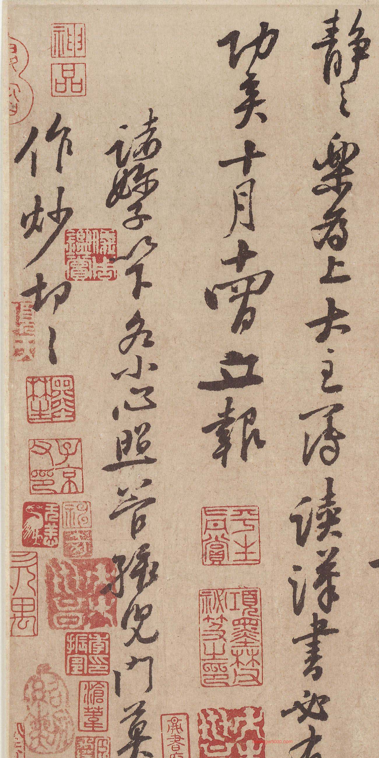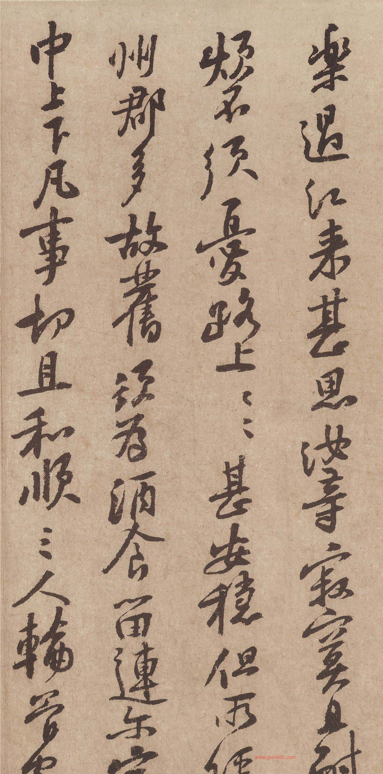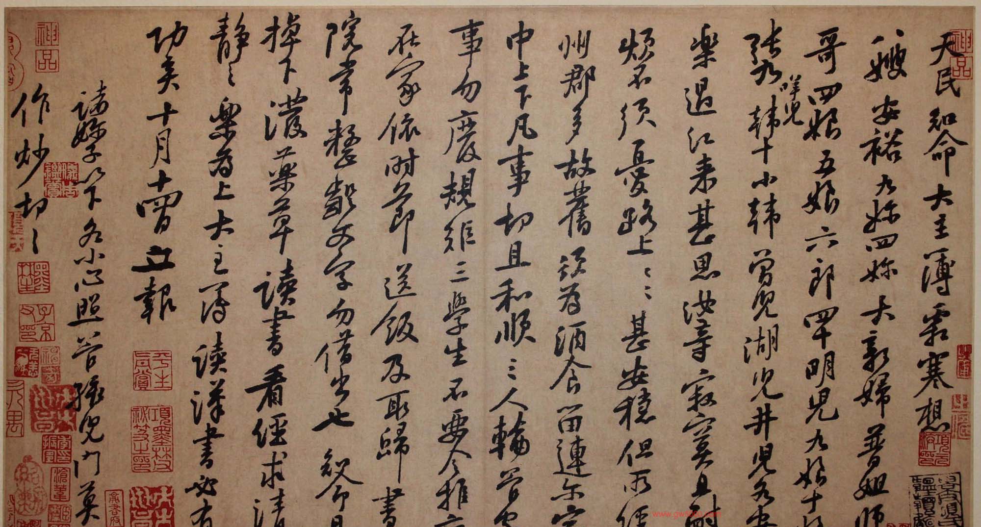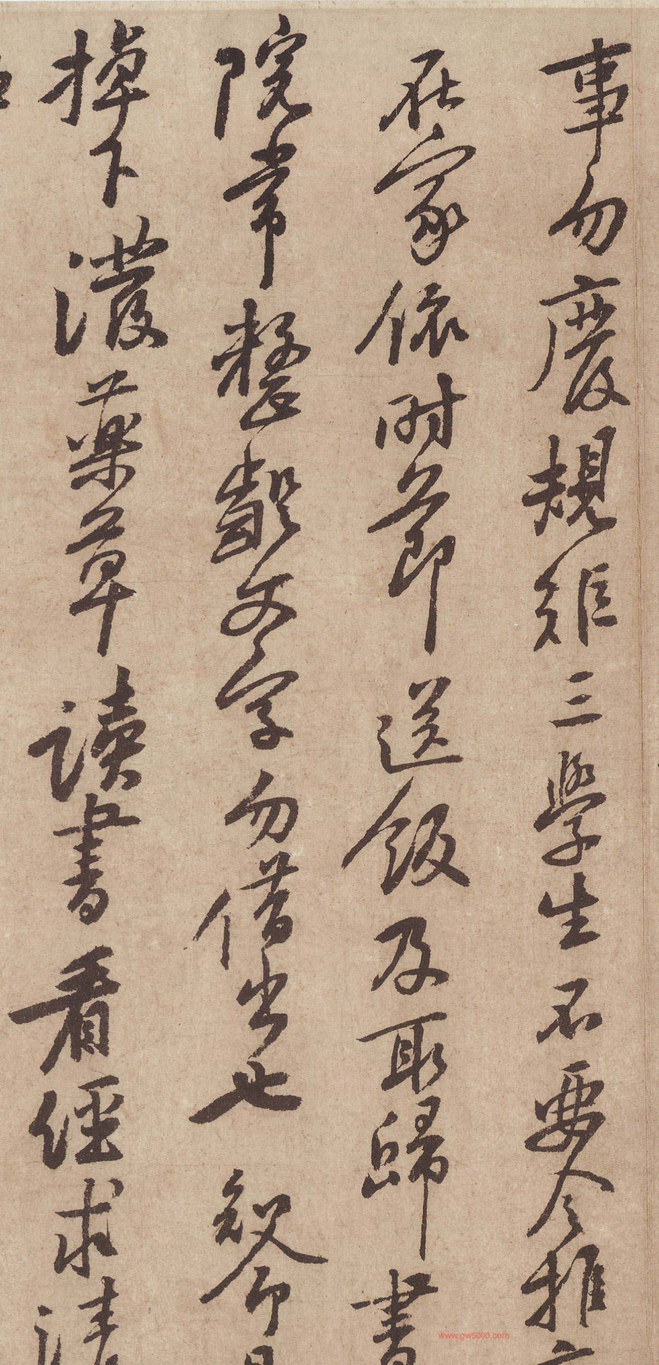 释文:天民、知命、大主簿:霜寒,想八嫂安裕、九妳、四妳、大新婦、普姐、師哥、四娘、五娘、六郎、四十、明兒、九娘、十娘、張九(咩兒)、韓十、小韓、曾兒、湖兒、井兒,各安樂。過江來,甚思汝等,寂寞且耐煩,不須憂路上,路上甚安穩。但所經州郡多故舊,須爲酒食留連爾。家中上下,凡事切且和順。三人輪管家事,勿廢規矩。三學生不要令推病在家,依時節送飯及取歸。書院常整齪、文字勿借出也。知命且掉下潑藥草,讀書看經,求清靜之樂爲上,大主簿讀《漢書》必有功矣。十月十四日,立報。諸嬭子以下,各小心照管孩兒們,莫作炒,切切。