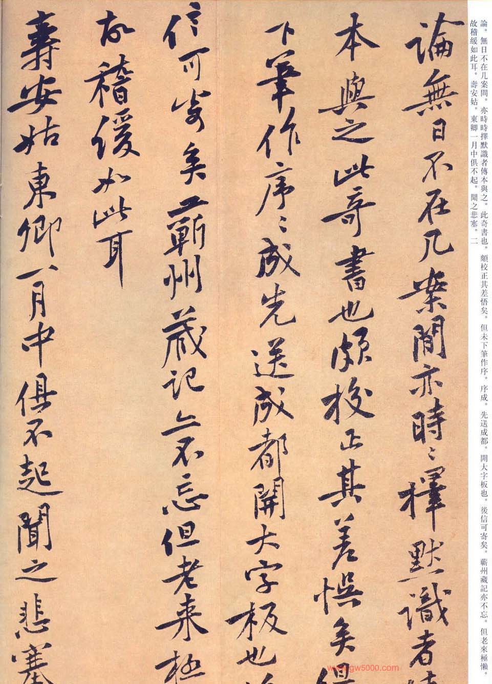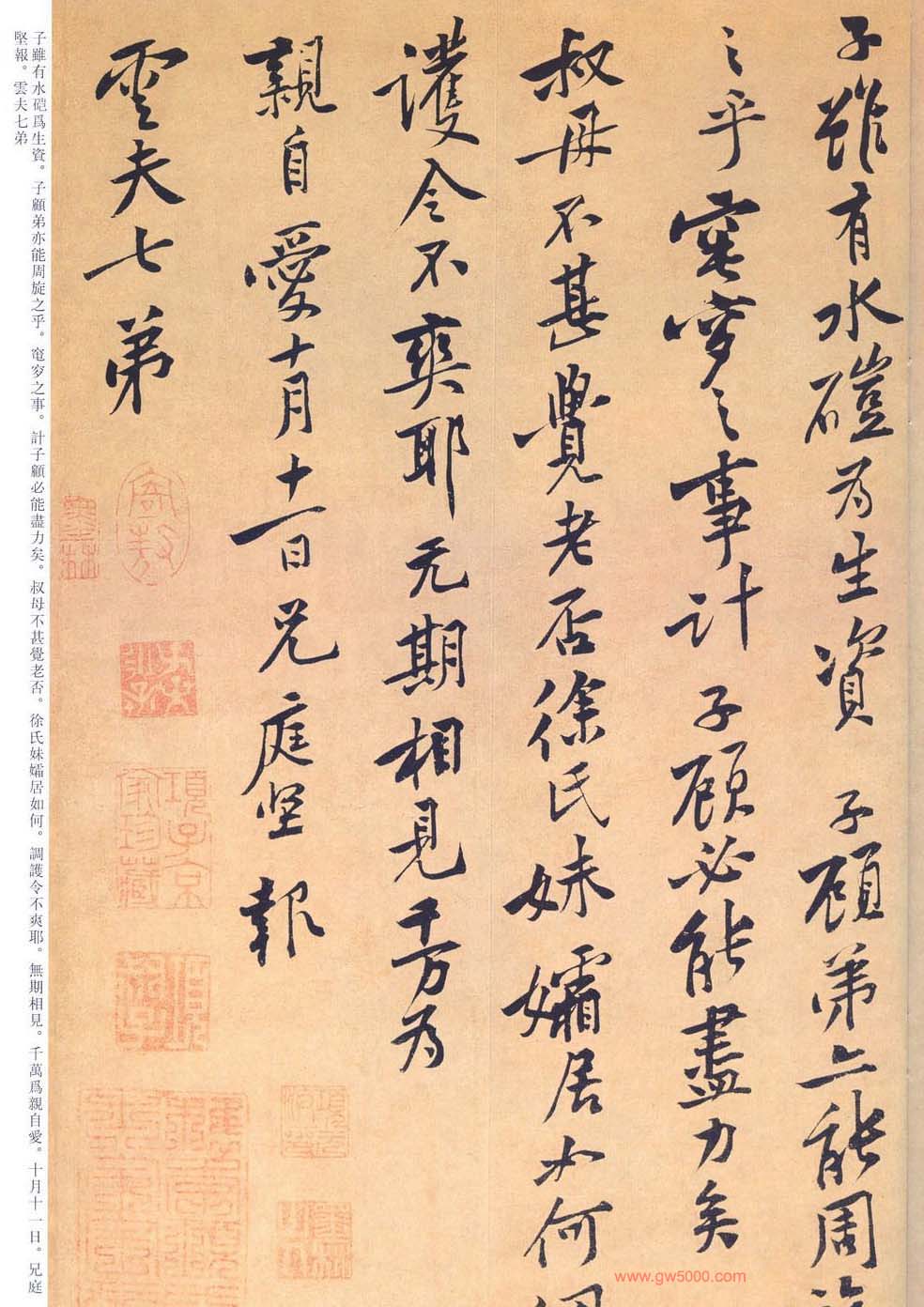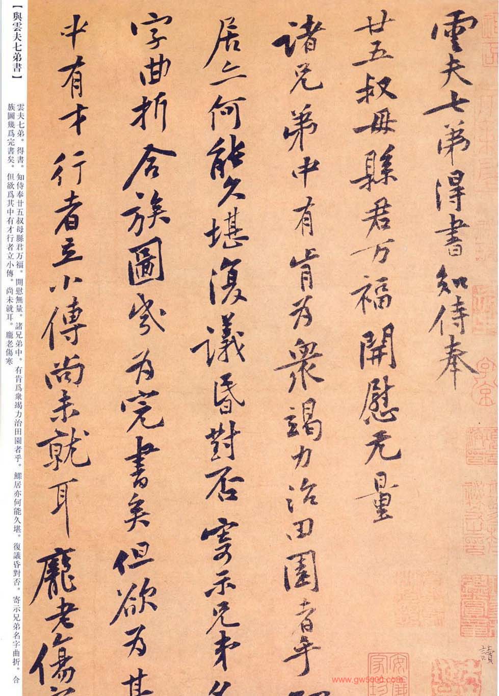 释文:云夫七弟:得书,知侍奉廿五叔母县君万福,开慰无量。诸兄弟中有肯为众竭力治田园者乎?鳏居亦何能久堪,复议昏对否?寄示兄弟名字曲折,合族固,几为完书矣c但欲为其中有才行者立小传,尚未就耳。庞老《伤寒论》无日不在油案间,亦时时择默识者传本与之。此奇书也,颇校正其差误矣,但末下笔作序。序成,先迭成都开大字板也,谈信可寄矣。蕲州州藏记亦不忘,但老来极懒,故稽缓如此耳。寿安姑、东卿一月中俱不起,闻之悲塞。二子虽有水皑为生资,子顾弟乔能周旋之乎?窀穸之事,计子顾必能尽力矣。叔母不甚觉老否?徐氏妹孀居,如何调护令不爽邪?无期相见,千万为亲自爱。十月十日,兄庭坚报云夫七。