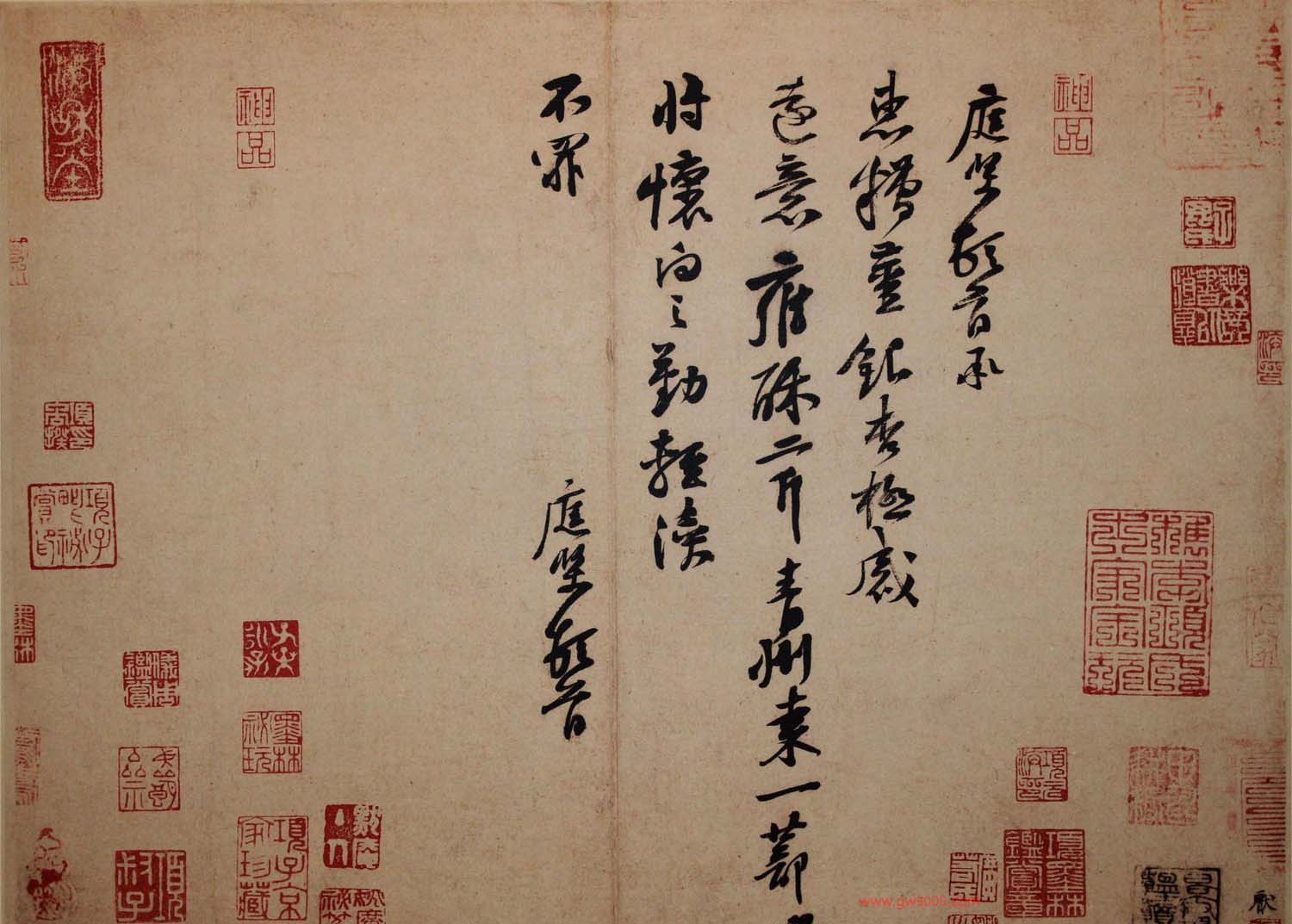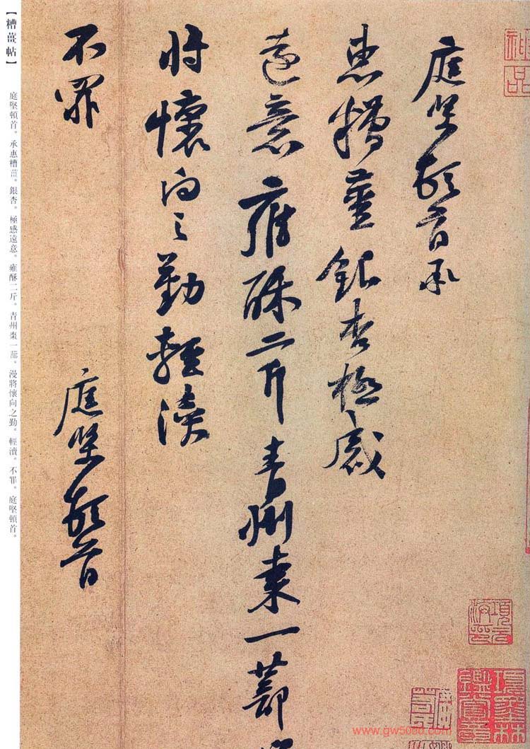 释文:庭坚顿首,承惠糟姜银杏,极感远意,雍酥二斤,青州枣一蔀,漫将怀向之勤,轻渎不罪,庭坚顿首。