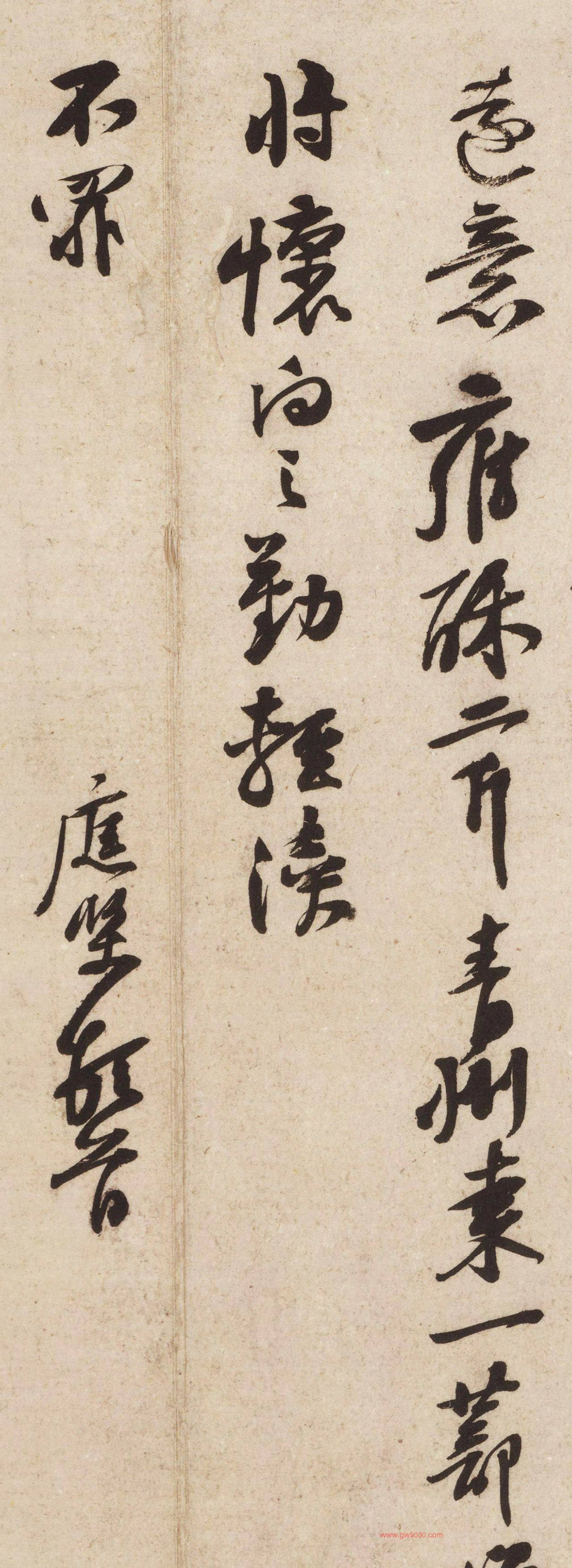 《糟姜帖》为黄庭坚中期代表作品。此帖深得张旭、怀素草书飞动洒脱之神韵。用笔紧峭,瘦劲奇崛,气势雄健,结体变化多端。从首行下笔处,便见笔墨自由舒展,至末尾更显随意,可谓心手双畅,臻入化境。此篇手札虽小,而意含万千气象,达到了东坡所谓“少小时须气象峥嵘、彩色绚烂,渐老渐熟,乃造平淡”、“无意于佳乃佳”的境界。