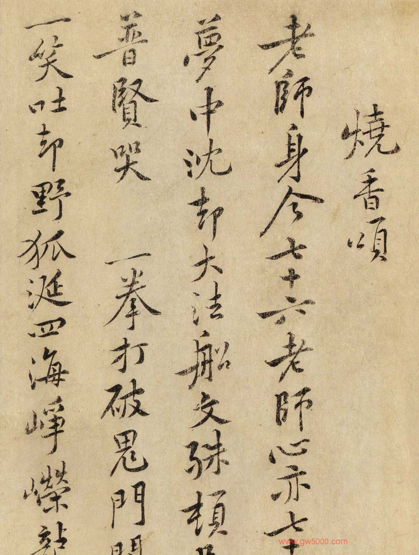 老师身今七十六,老师心亦七十六。梦中沈却大法船,文殊顿足普贤哭。一拳打破鬼门关,一笑吐却野狐涎。四海峥嵘龙象众,鼻头只用短绳牵。海风吹落楞伽山,四海禅徒著眼看。一把柳丝收不得,和风搭在玉阑干。
