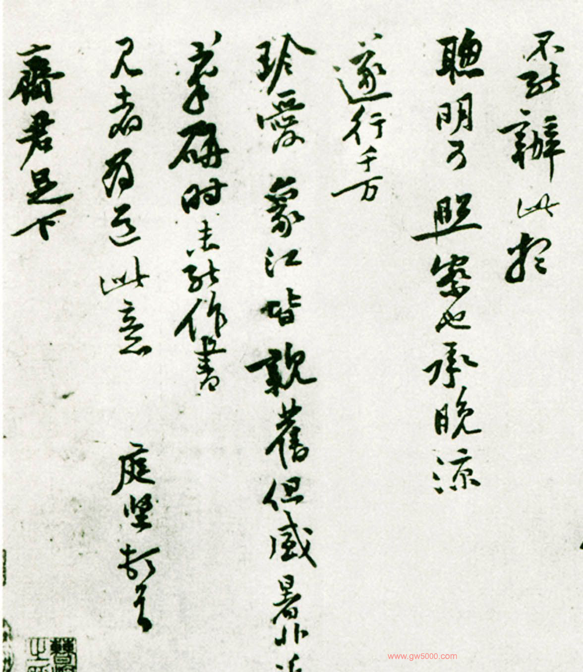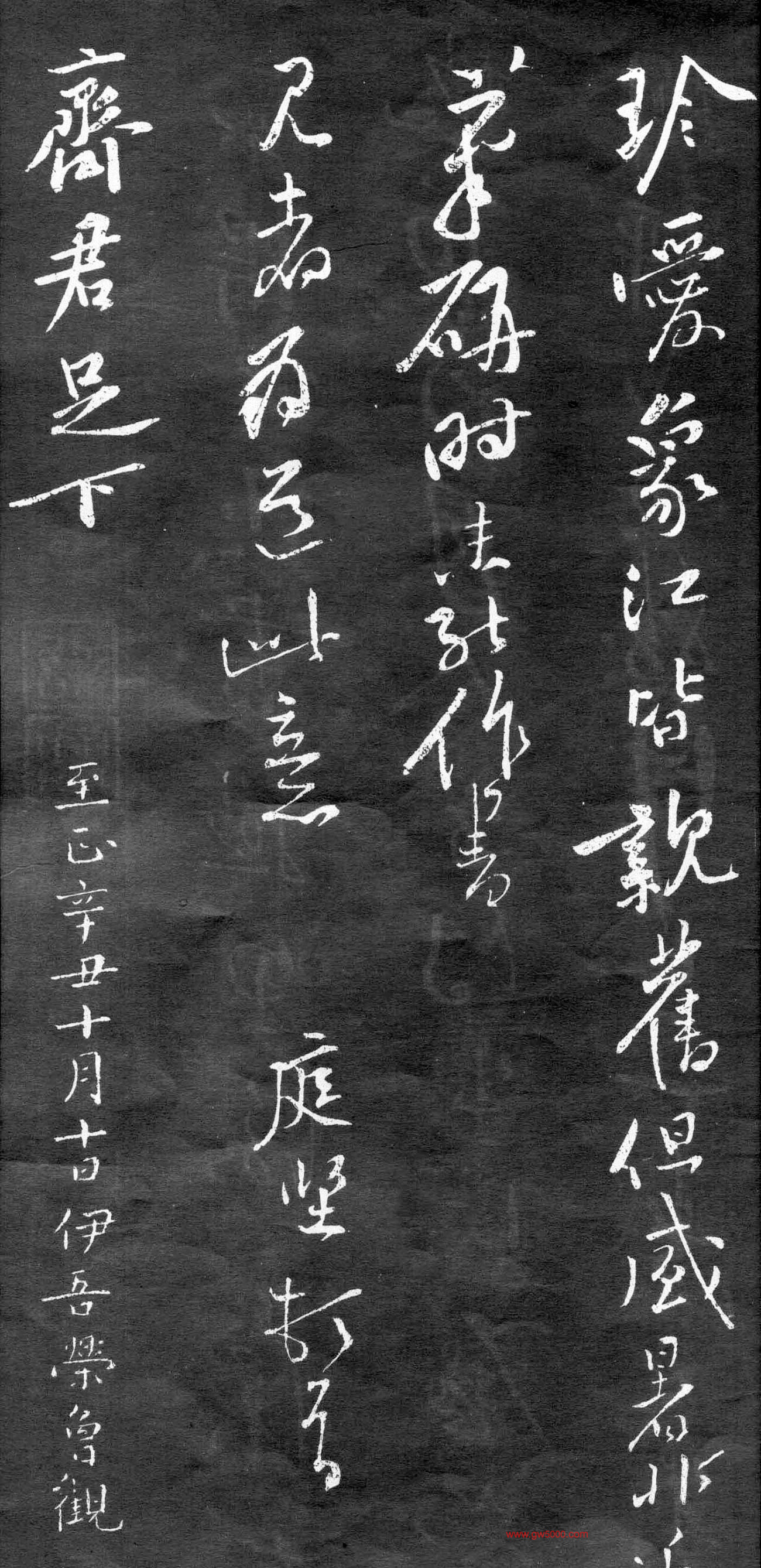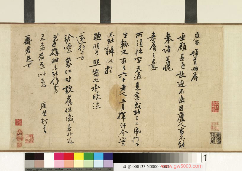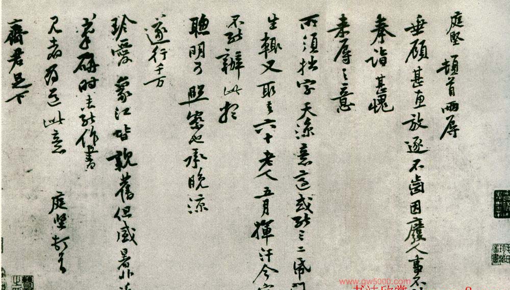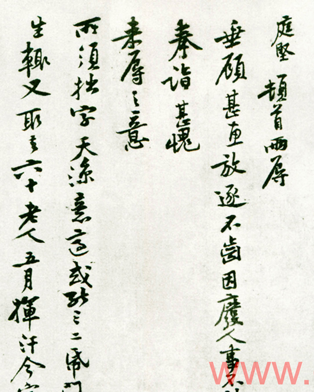 释文:庭坚顿首。两辱垂顾,甚惠。放逐不齿,因废人事。不能奉诣,其愧来辱之意。所须拙字,天凉意适,或能三二纸,门下生辄又取去。六十老人,五月挥汗,今实不能办此,想聪明可照察也。承晚凉遂行,千万珍爱。象江皆亲旧,但盛暑非近笔砚时,未能作书,见者为道此意。庭坚顿首,齐君足下。
