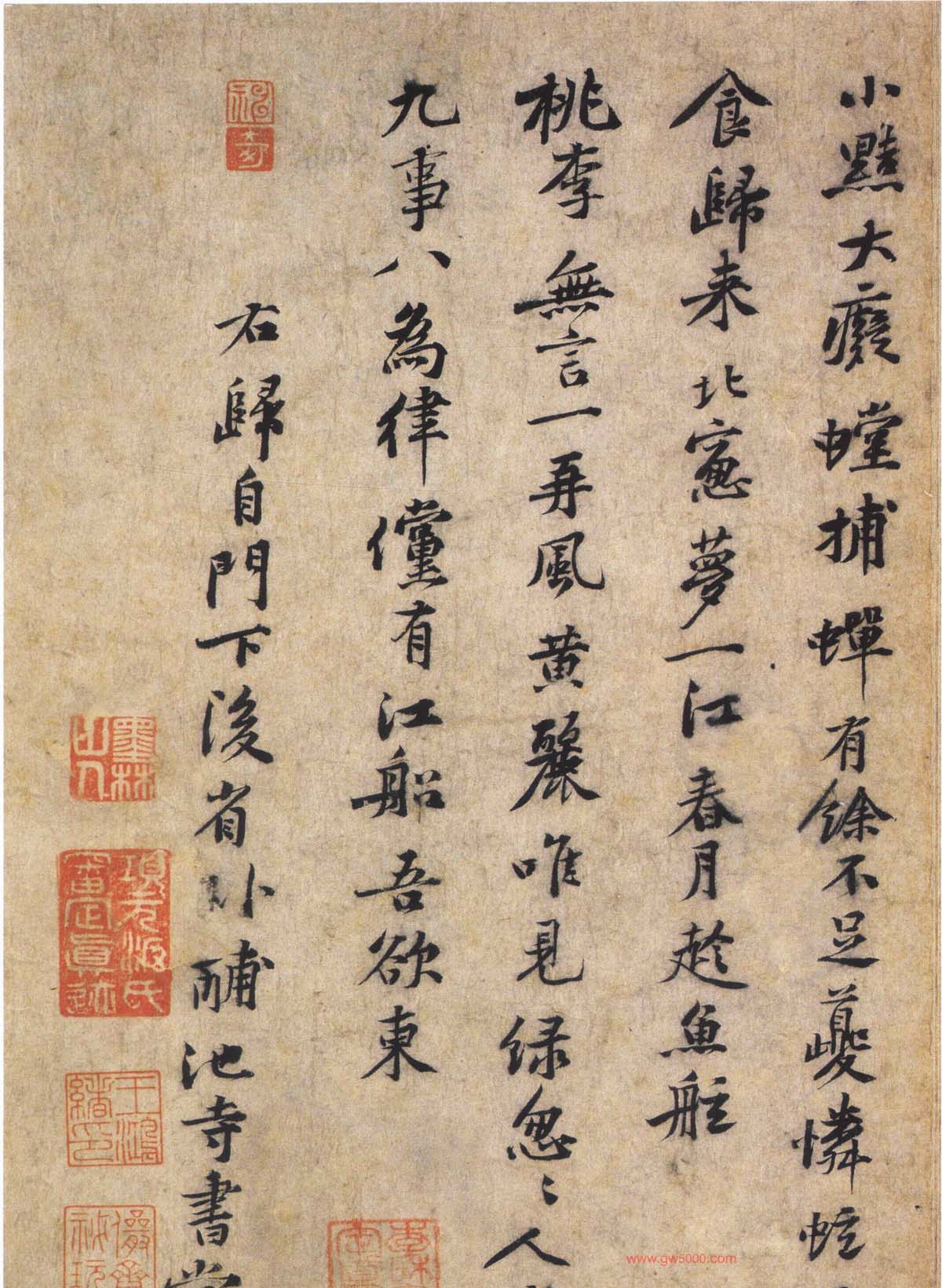 释文:九陌黃塵烏帽底。五湖春水白鷗前。扁舟不為鱸魚去。收取聲名四十年。甓社湖中有明月。淮南草木借光輝。故應剖蚌登王室。不若行沙弄夕霏。右奉呈外舅孫莘老。小黠大癡螳捕蟬。有餘不足夔憐蚿。退食歸來北窗夢。一江春月趁魚舷。桃李無言一弄風。黃麗唯見綠怱怱。人言九事八為律。儻有江船吾欲東。右歸自門下後省臥酺池寺書堂。