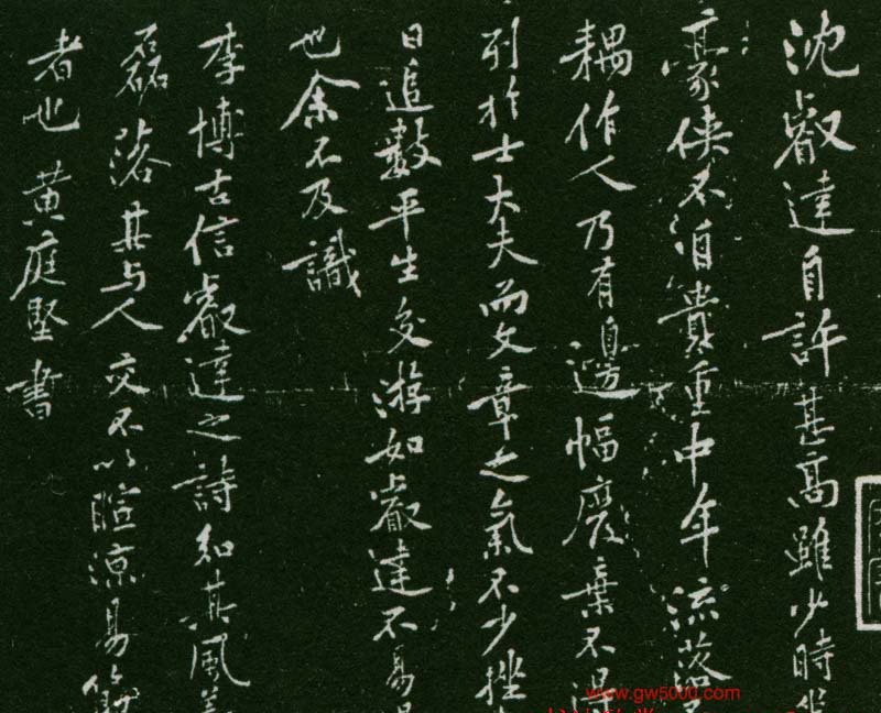 黄庭坚擅文章、诗词,尤工书法。诗风奇崛瘦硬,力摈轻俗之习,开一代风气。早年受知于苏轼,与张耒、晁补之、秦观并称“苏门四学士”。诗与苏轼并称“苏黄”,有《豫章黄先生文集》。词与秦观齐名,有《山谷琴趣外篇》、龙榆生《豫章黄先生词》。词风流宕豪迈,较接近苏轼,为“江西诗派”之祖。晁补之云:“鲁直间作小词固高妙,然不是当行家语,自是著腔子唱好诗。”(见《诗人玉屑》)另有不少俚词,不免亵诨。有《山谷词》又名《山谷琴趣外篇》。