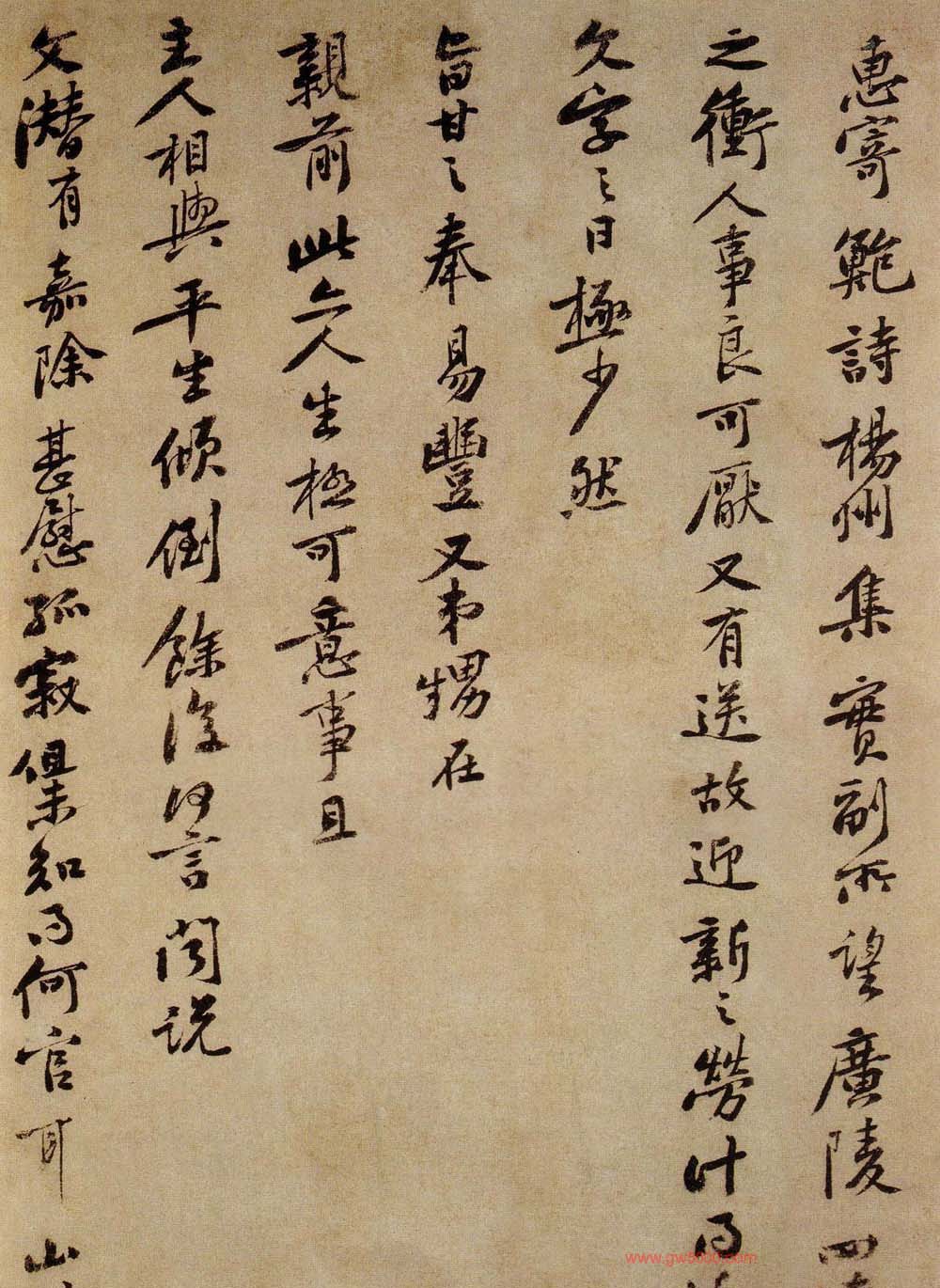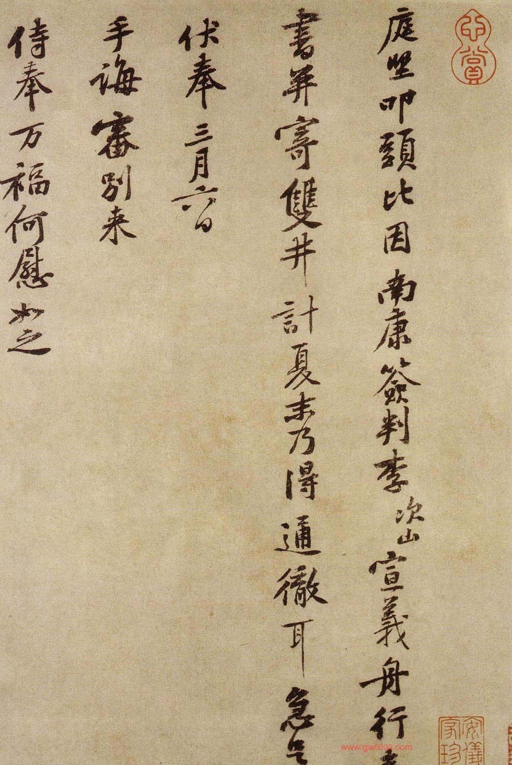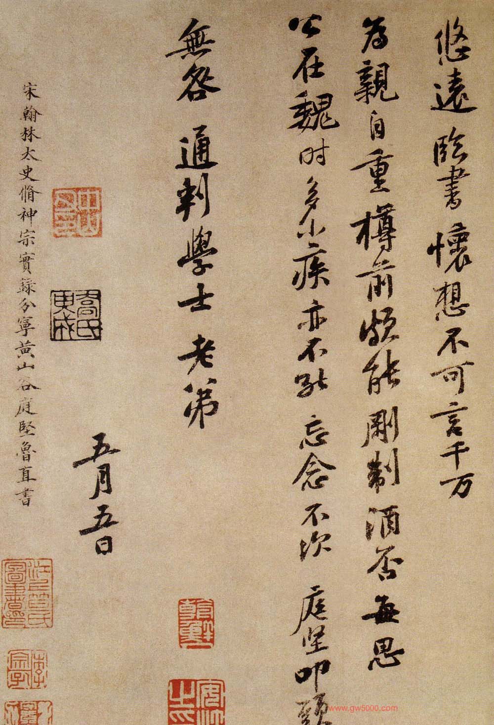 释文:庭坚叩头,比因南康签判李次山宣义舟行。奉书,并寄双井,计夏末乃得通彻耳。急足者伏奉三月六日手诲,审别来侍奉万福,何慰如之。惠寄鲍诗、扬州集,实副所望。广陵四达之冲,人事良可厌。又有送故迎新之劳,计得近文字之日极少,然旨甘之奉易丰。又弟甥在亲前,此亦人生极可意事,且主人相与平生倾倒,余复何言。闻说文潜有嘉除,甚慰孤寂,但未知得何官耳。山川悠远,临书怀想不可言,千万为亲自重,樽前颇能刚制酒否?每思公在魏时,多小疾,亦不能忘念,不次。庭坚叩头上无咎通判学士老弟。五月五日。