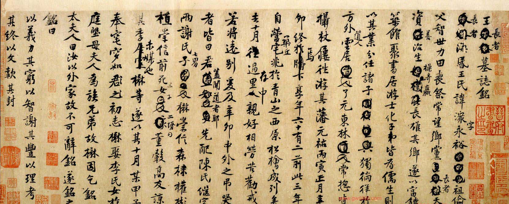 北宋黄庭坚行书墨迹欣赏《王长者墓志铭稿》纸本,30.3×78.5cm,凡22行,328字。书于元祐元年(1086年)。钤有“晋府书画之印“、“希世之宝”等印记。日本东京国立博物馆藏。