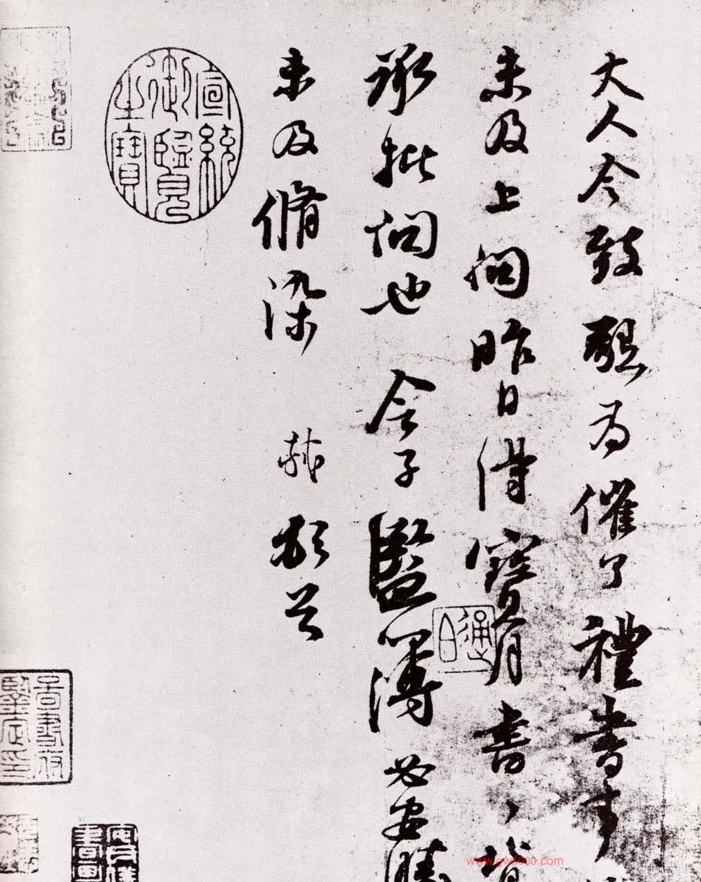 此帖四行,四十二字。每字各具姿态,皆以筋骨立形,以神情润色,灵变无常,神采飞扬。行间气脉贯串,全幅气韵生动。笔法精严,但不拘束;姿态妍美,但不做作;一切自在有法、无法之间。作者的学问才气发于笔端,与书札的萧散风格相吻合。