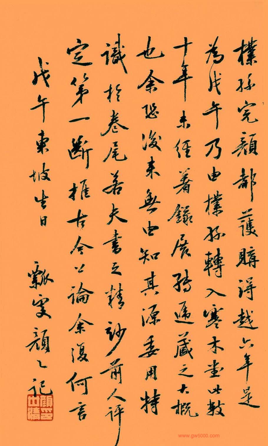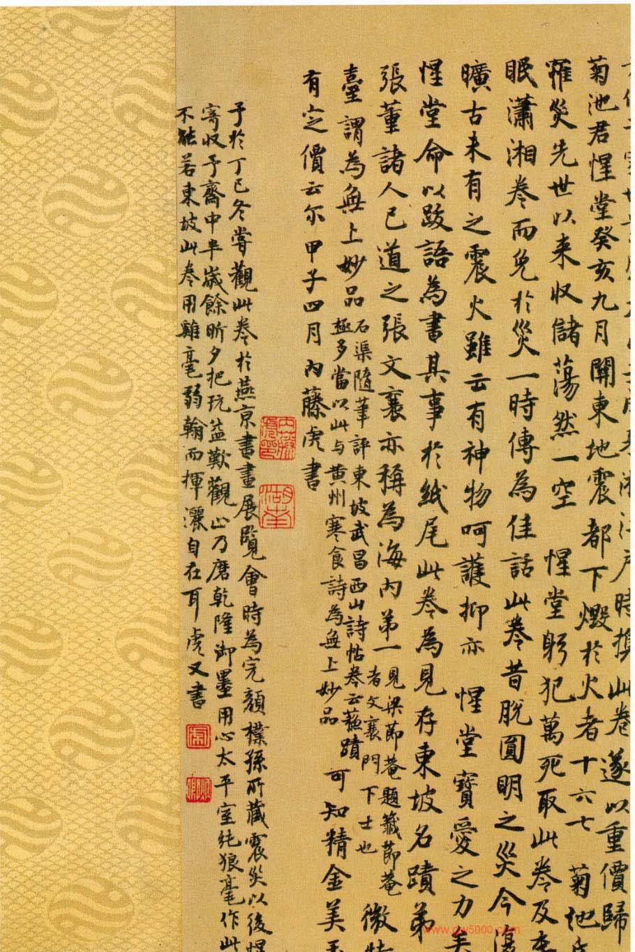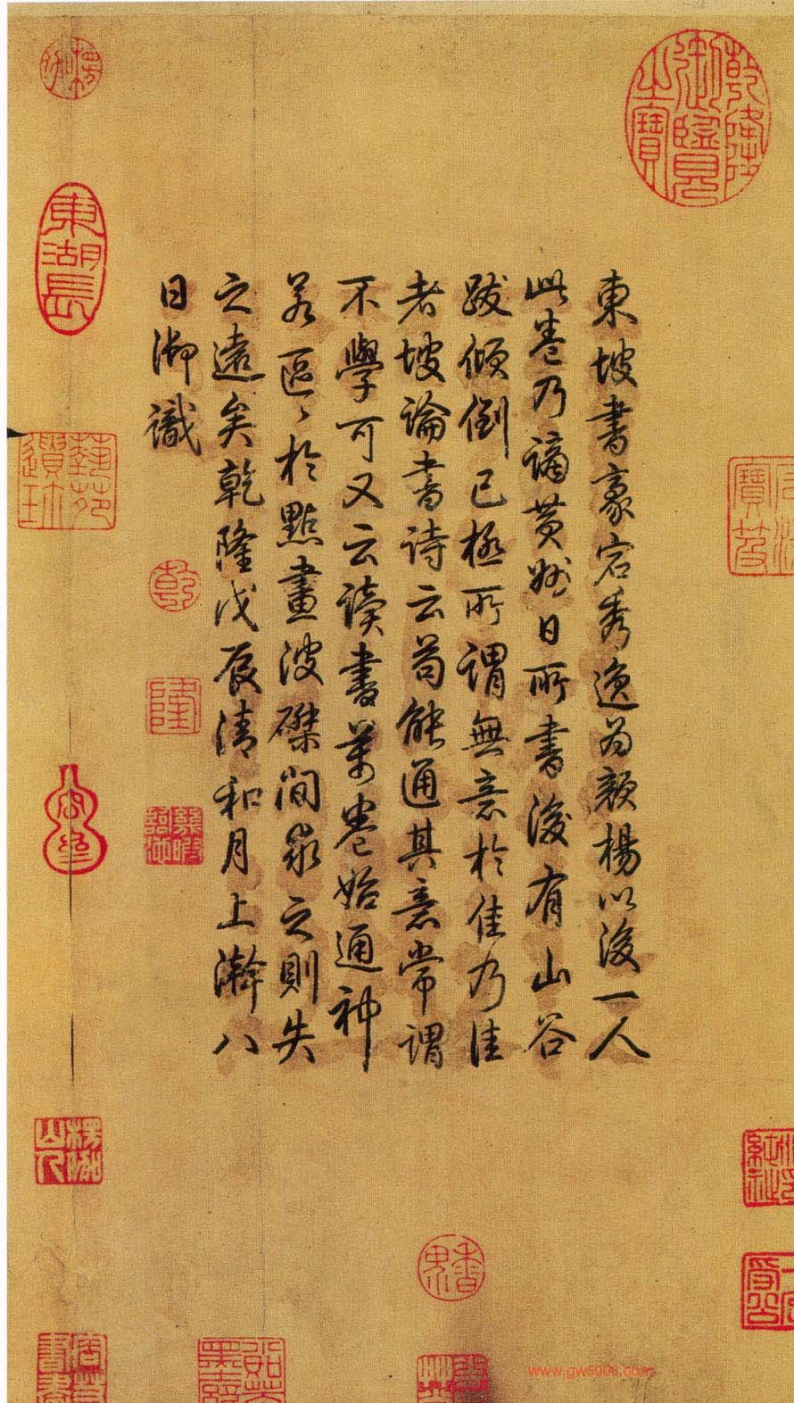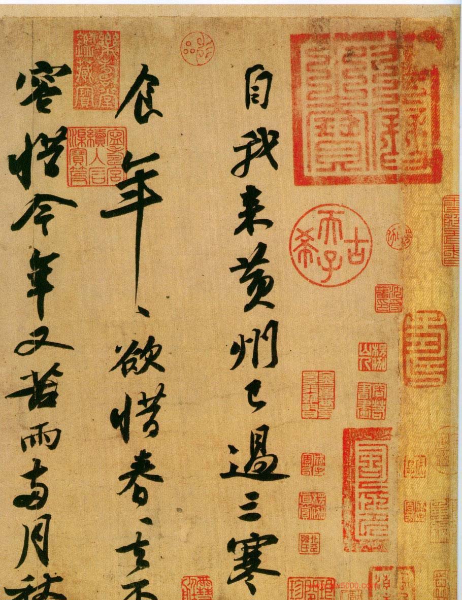 这是一首遣兴的诗作,是苏轼被贬黄州第三年的寒食节所发的人生之叹。诗写得苍凉多情,表达了苏轼此时惆怅孤独的心情。此诗的书法也正是在这种心情和境况下,有感而出的。通篇书法起伏跌宕,光彩照人,气势奔放,而无荒率之笔。《黄州寒食诗帖》在书法史上影响很大,被称为“天下第三行书”,也是苏轼书法作品中的上乘。正如黄庭坚在此诗后所跋:“此书兼颜鲁公,杨少师,李西台笔意,试使东坡复为之,未必及此。”