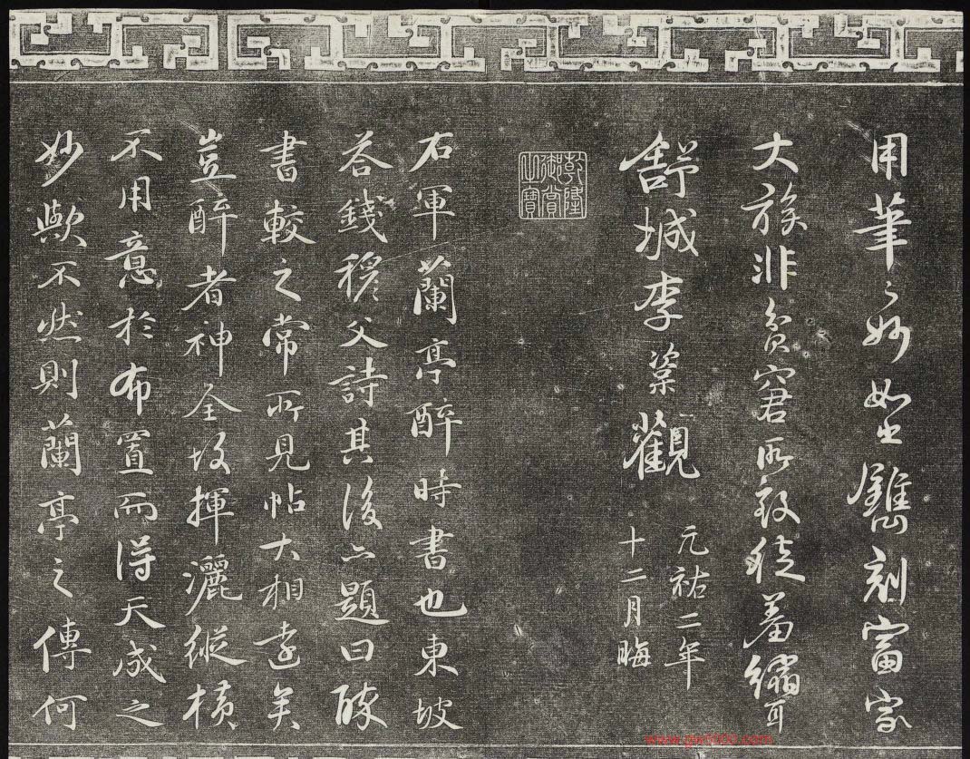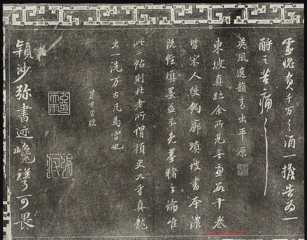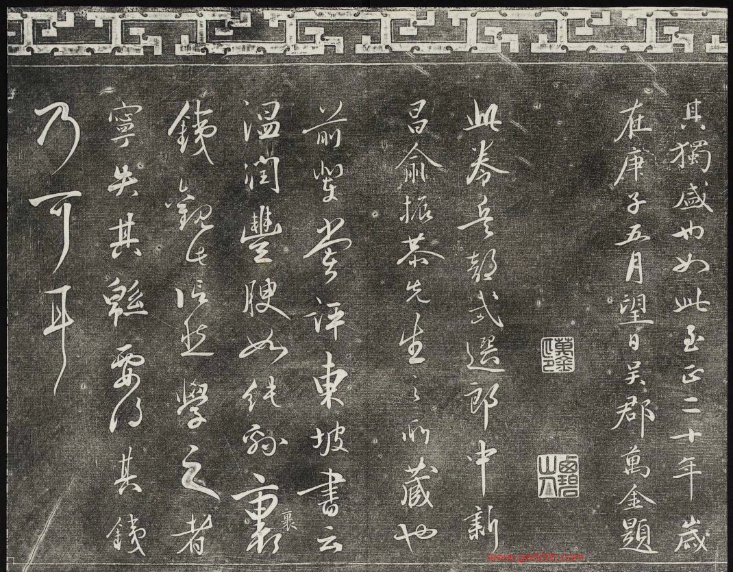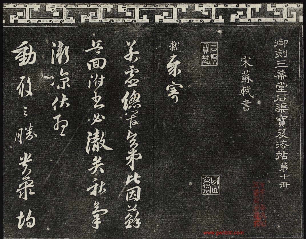 御刻三希堂石渠宝笈法帖第十册苏轼法帖,乾隆15年(1750)刻石,原石现在北京北海公园。本册收录苏轼等书法帖图40张。