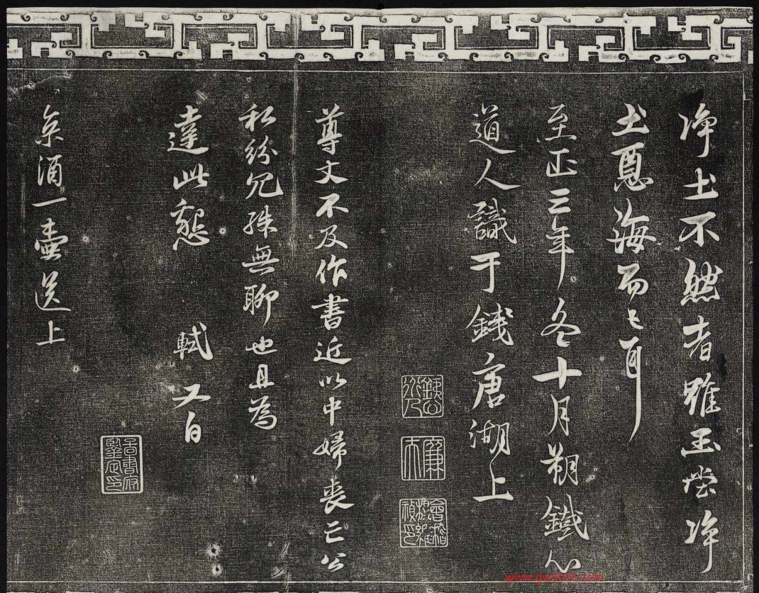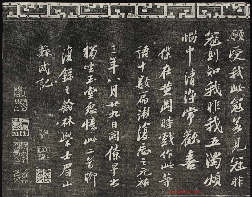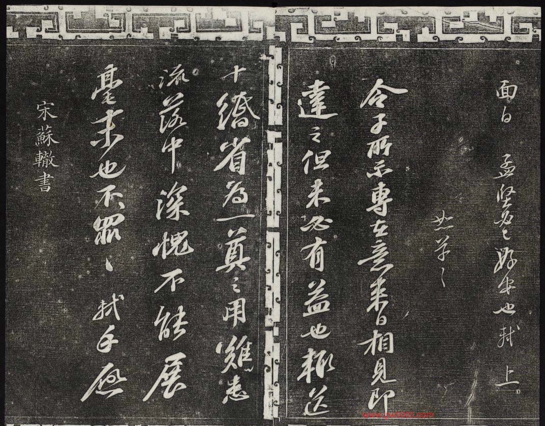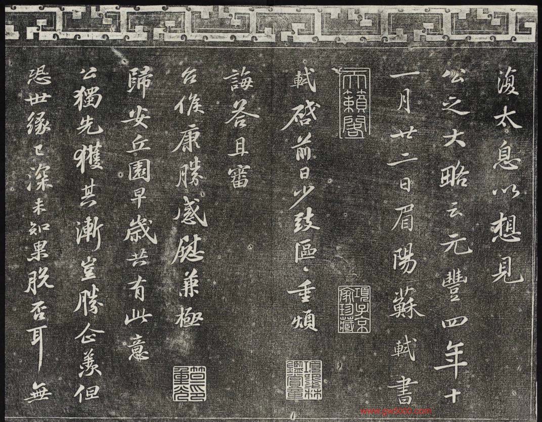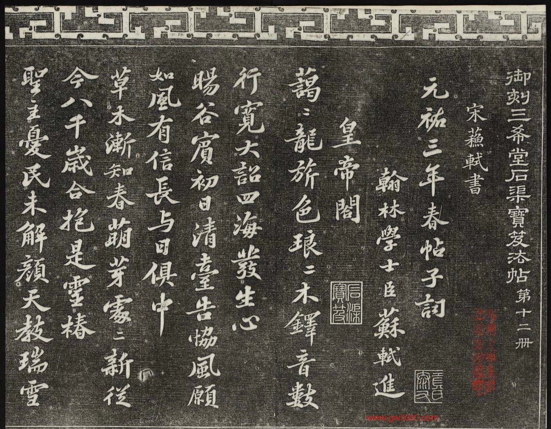御刻三希堂石渠宝笈法帖第十二册苏轼法帖,乾隆15年(1750)刻石,原石现在北京北海公园。本册收录苏东坡等书法拓片38张。
