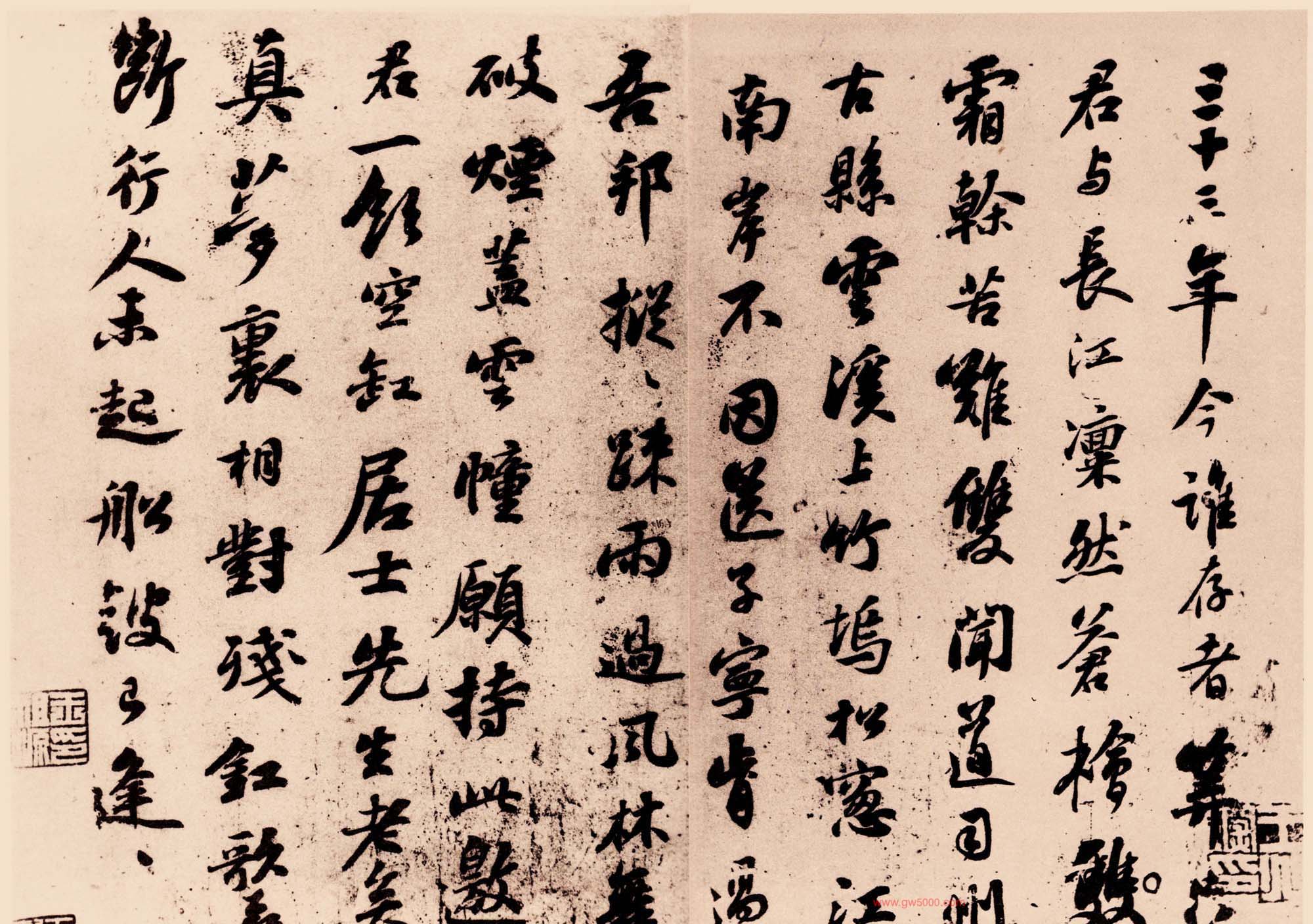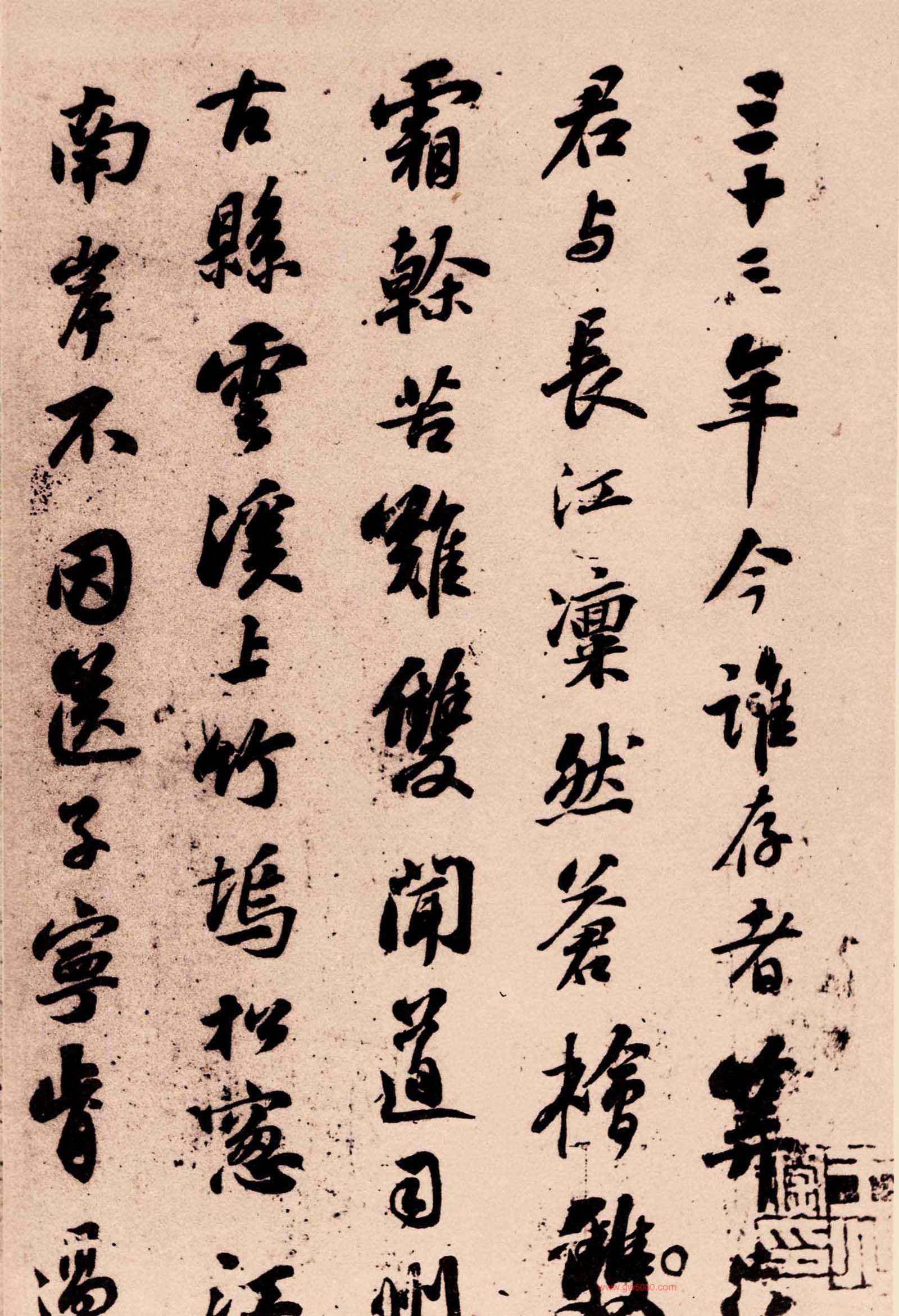 释文:三十三年,今谁存者?算只君与长江。凛然苍桧,双(圈去)霜干苦难双。闻道司州古县,云溪上、竹坞松窗。江南岸,不因送子,宁肯过吾邦?(詍)(詍),疏雨过,风林舞破,烟盖云幢。愿持此邀君,一饮空缸。居士先生老矣!真梦裹、相对残釭,歌声断,行人未起,船鼓已逢逢。