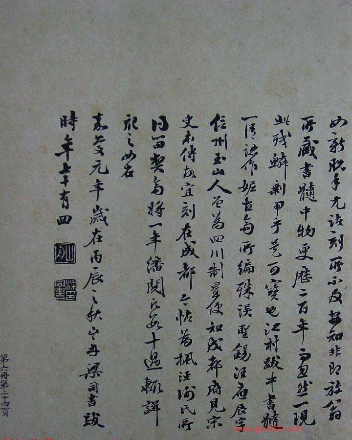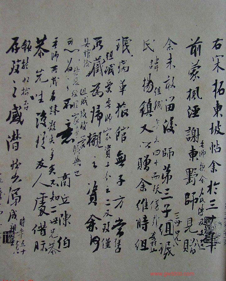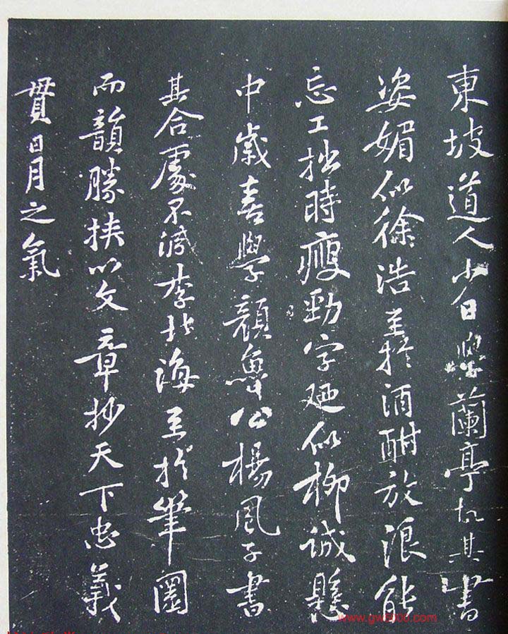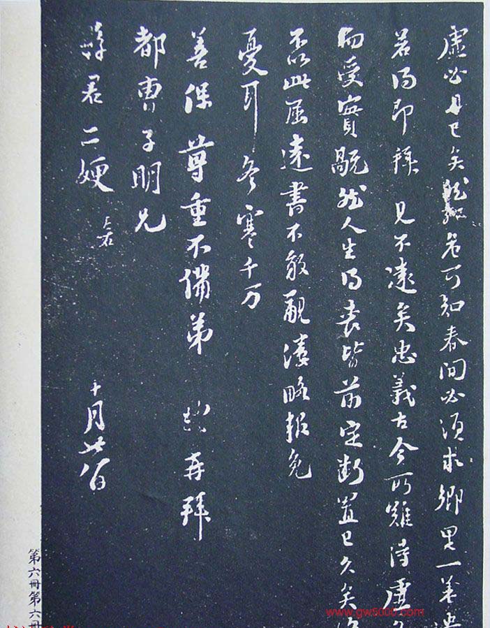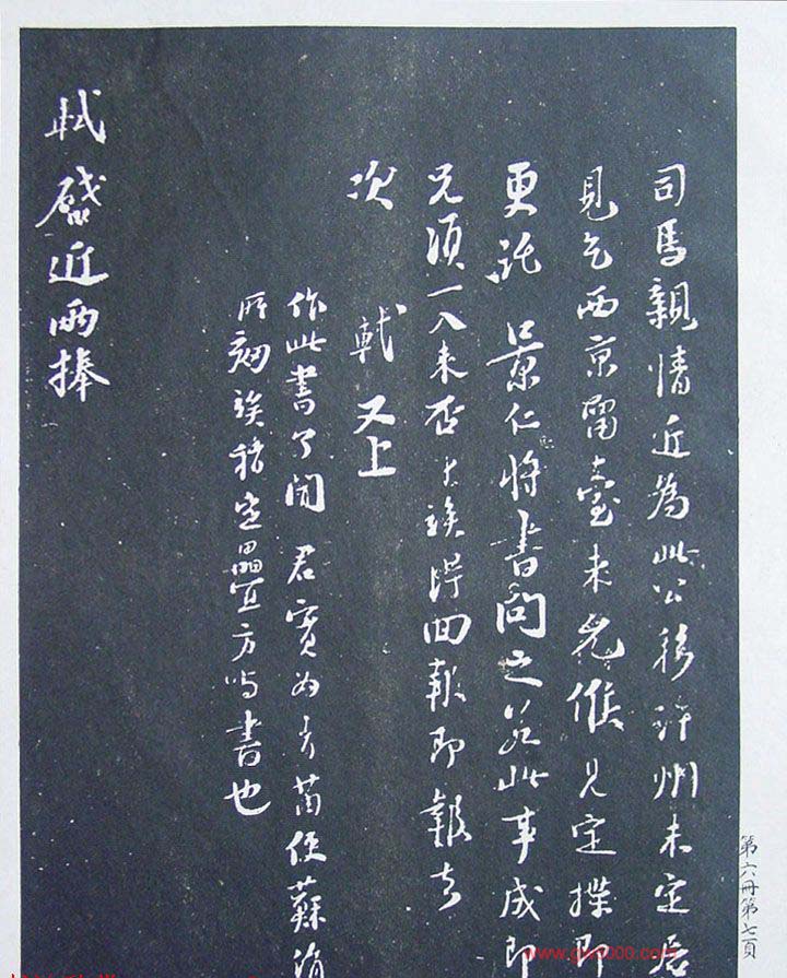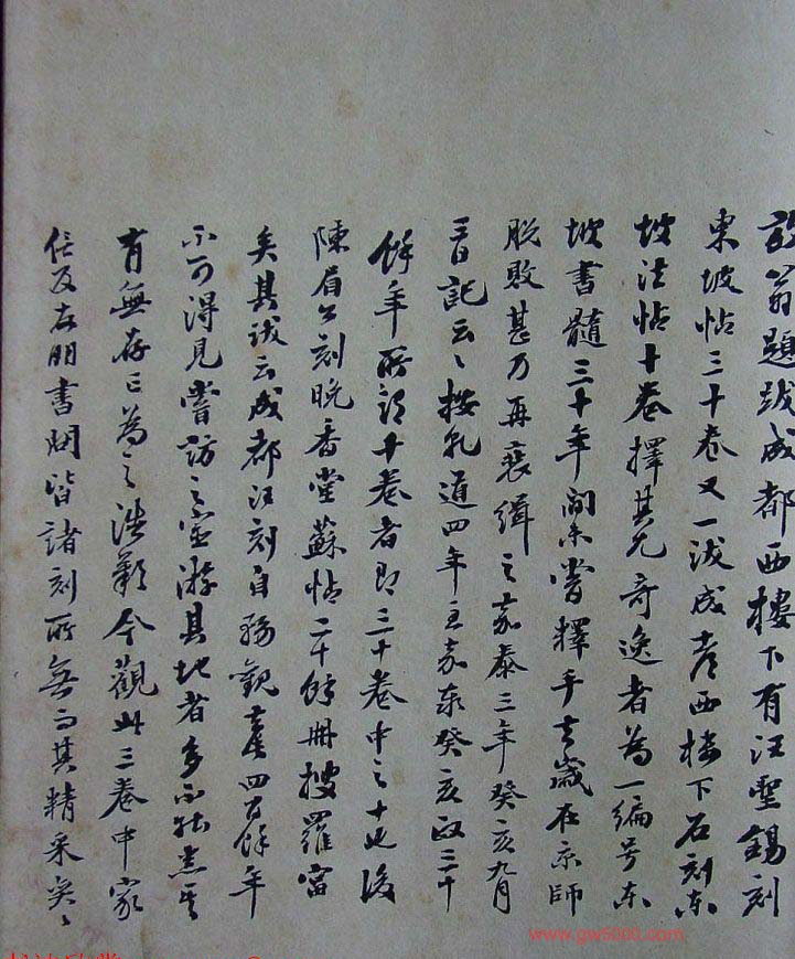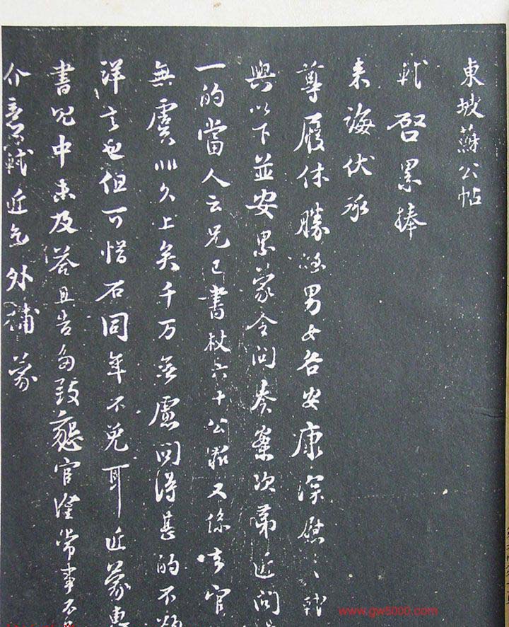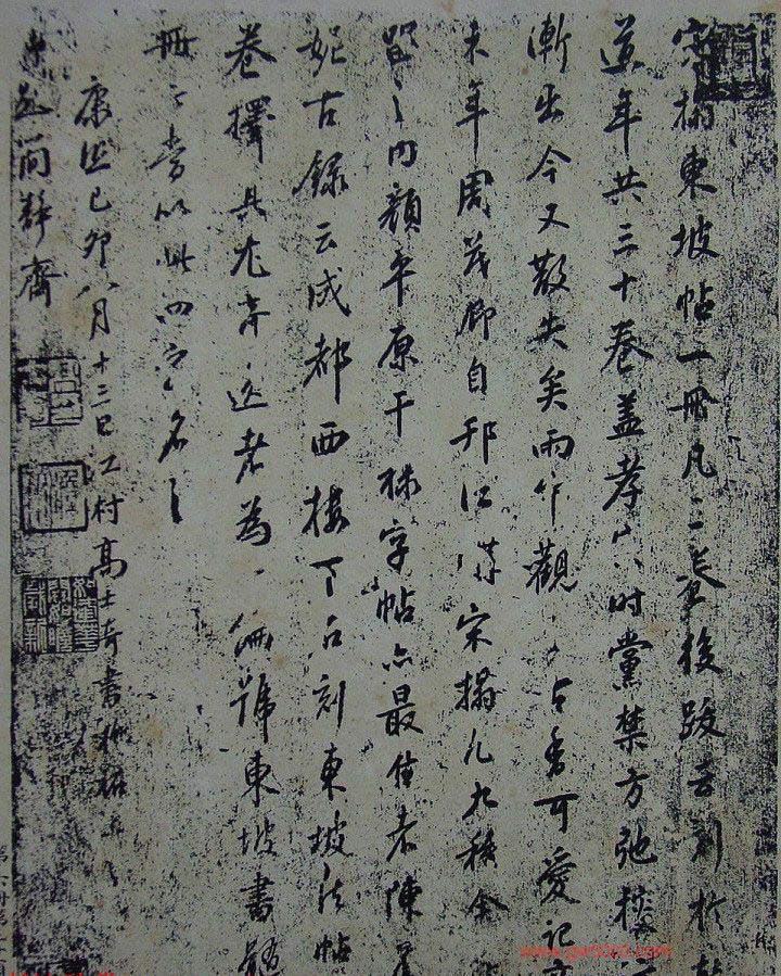 《宋拓西楼苏帖东坡书髓》第六册匋斋旧藏本,民国文明书局影印《东坡苏公帖》,又名《东坡书髓》、《西楼帖》,为苏轼书迹刻帖。宋乾道四年(1168)汪应辰撰集,刻于成都。末尾跋云:“东坡苏公帖三十卷。每搜访所得,即以入石,不复铨次也。乾道四年三月一日,玉山汪应辰书。”又有陆游跋:“成都西楼下有汪圣锡刻东坡帖卅卷。”“西楼下石刻东坡法帖十卷,择其尤奇逸者为一编,号《东坡书髓》,三十年间未尝释手,去岁在京师,脱败,再装缉之。”清道光间,南海廖甡选翻此帖部分而成《观海堂苏帖》,其后又有长白瑛桂翻刻此帖部分,仍名《东坡苏公帖》。
