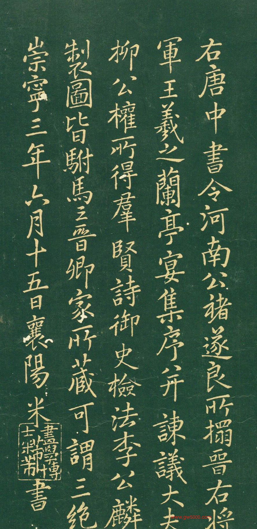 右唐中书令河南公褚遂良所搨晋右将军王羲之兰亭宴集序,并谏议大夫柳公权所得群贤诗,御史检法李公麟制图,皆驸马王晋卿家所藏,可谓三绝。崇宁三年六月十五日,襄阳米芾书。