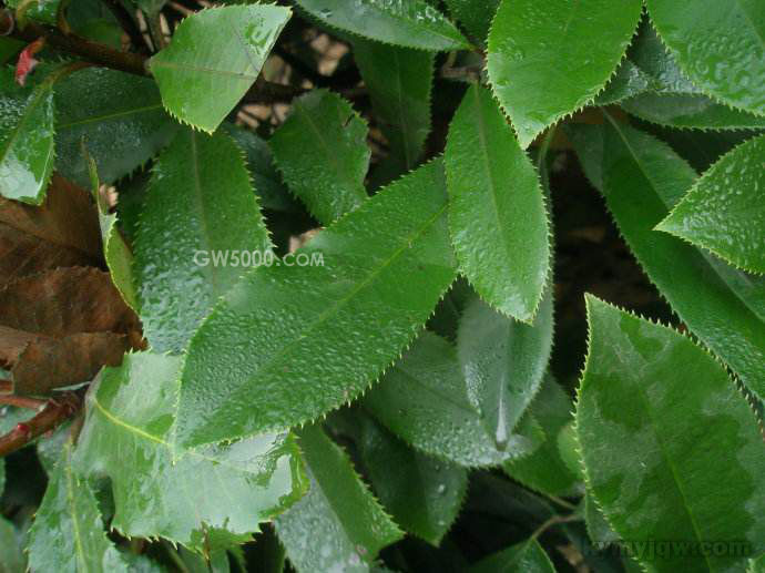 形态特征:干燥叶呈长椭圆形,长8~16厘米,宽3~6厘米,具叶柄;边缘有细密尖锐的锯齿,上面红棕色或暗棕色,下面色稍浅,主脉突起极明显,两面均平滑无毛。叶较厚,革质而脆。气无,味苦而涩。以棕黄色、无杂质者为佳。